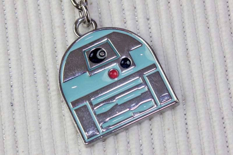 Another fabulous detail is the R2-D2 pendant attached to the left side. Made from a silver-tone metal, the pendant features R2-D2’s details on the front, accented with enamel (the back is plain). This pendant dangles from a chain attached to the seam, and is not removable – but I would never want to take it off, it’s such a great detail. The pendant measures approximately 26mm high and 26mm across, while the chain measures approximately 30mm long.