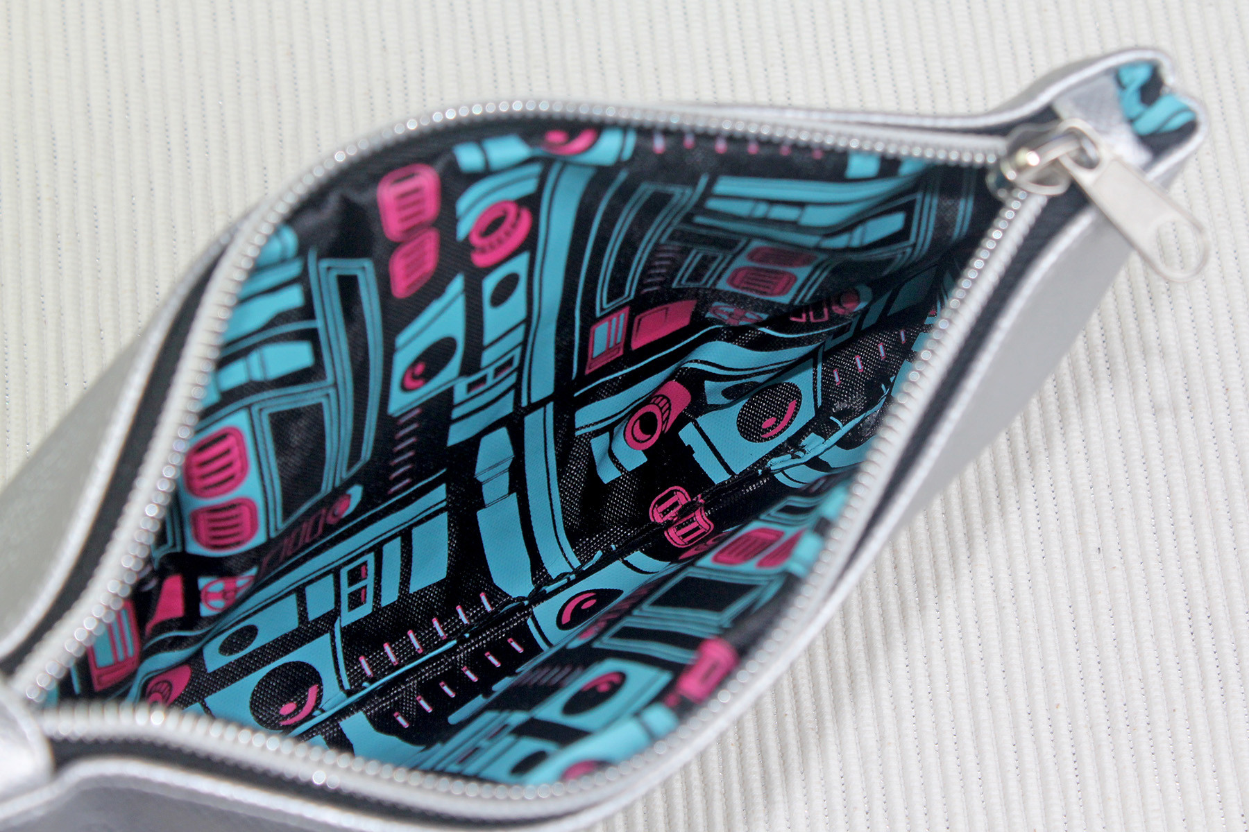 Inside there is a wonderful pop of colour, with a pink and cyan print on black lining fabric. The print is composed of astromech panel details – I just love this pattern, I would love to see it used for full garments! There are no pockets inside, which is pretty standard for a small size clutch.
