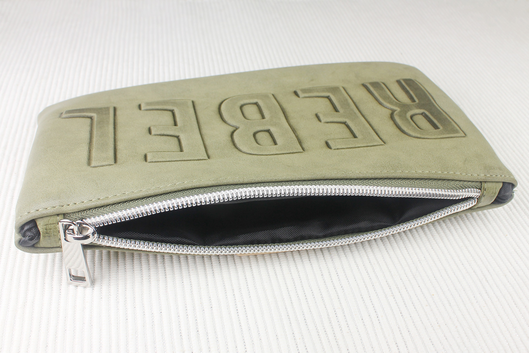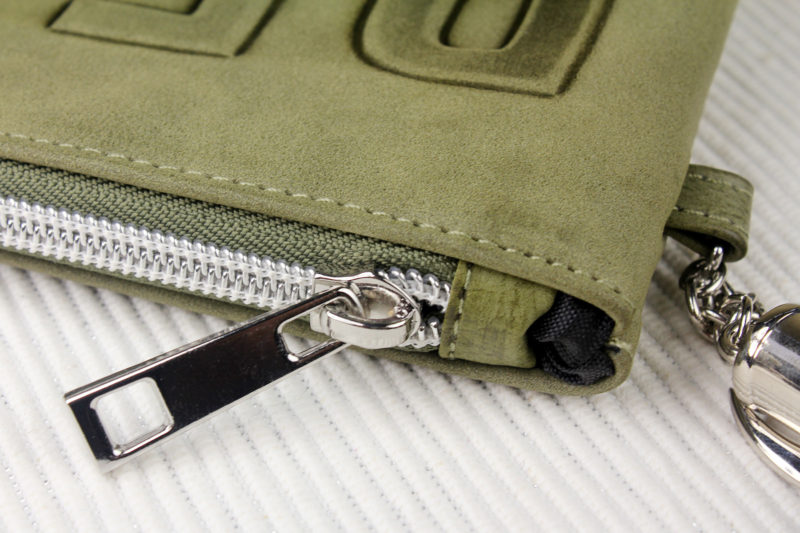 The clutch closes with a top zip – the green zipper backing matches the faux leather of the clutch, which is always nice to see. The zipper ‘teeth’ are silver tone plastic, with a silver tone metal zipper pull. I like the sturdiness of the zipper pull, which is a good size for grasping easily.