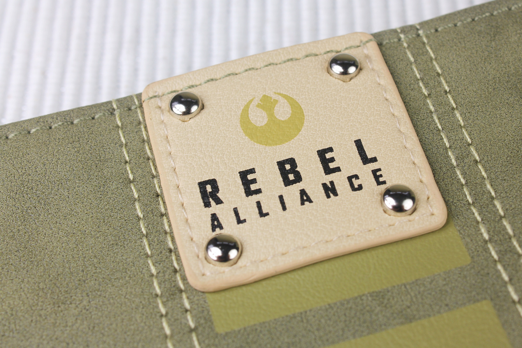 The back also features a small beige faux leather patch, which has a small printed Rebel Alliance ‘starbird’ symbol, and the text ‘Rebel Alliance’. The patch is attached with top stitching, and also has 4 silver tone stud details, one in each corner.
