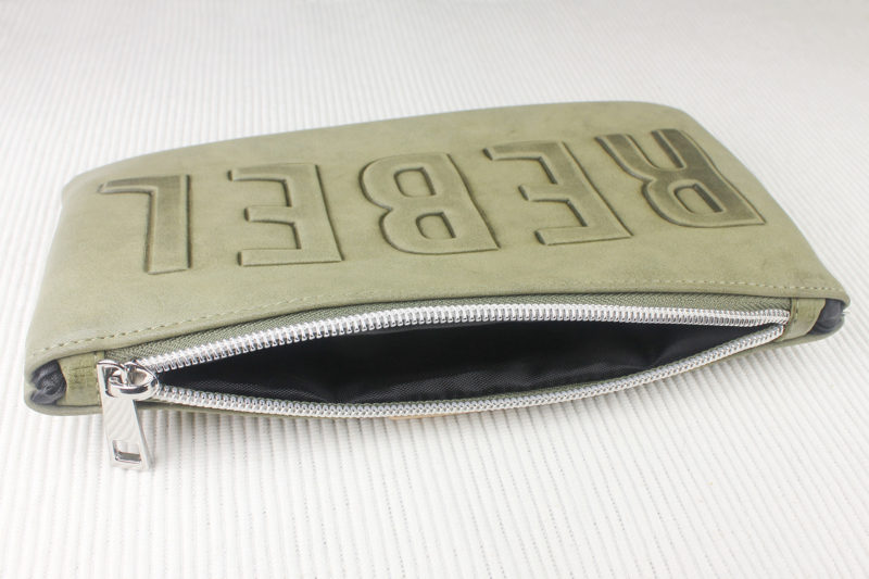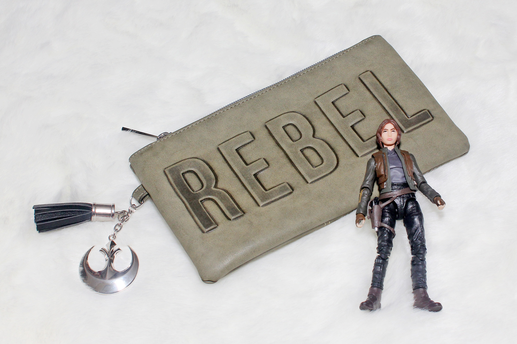 The Rebel clutch is made from a green faux leather, with the debossed text ‘REBEL’ on the front, 2 hanging pendants, a small faux leather patch on the back, and printed details. The debossed text is raised, with a darker tone outline to help accentuate the detail. The design has a great balance of looking ‘weathered’ like the Rebel costumes in Rogue One, but still stylish for a night out.