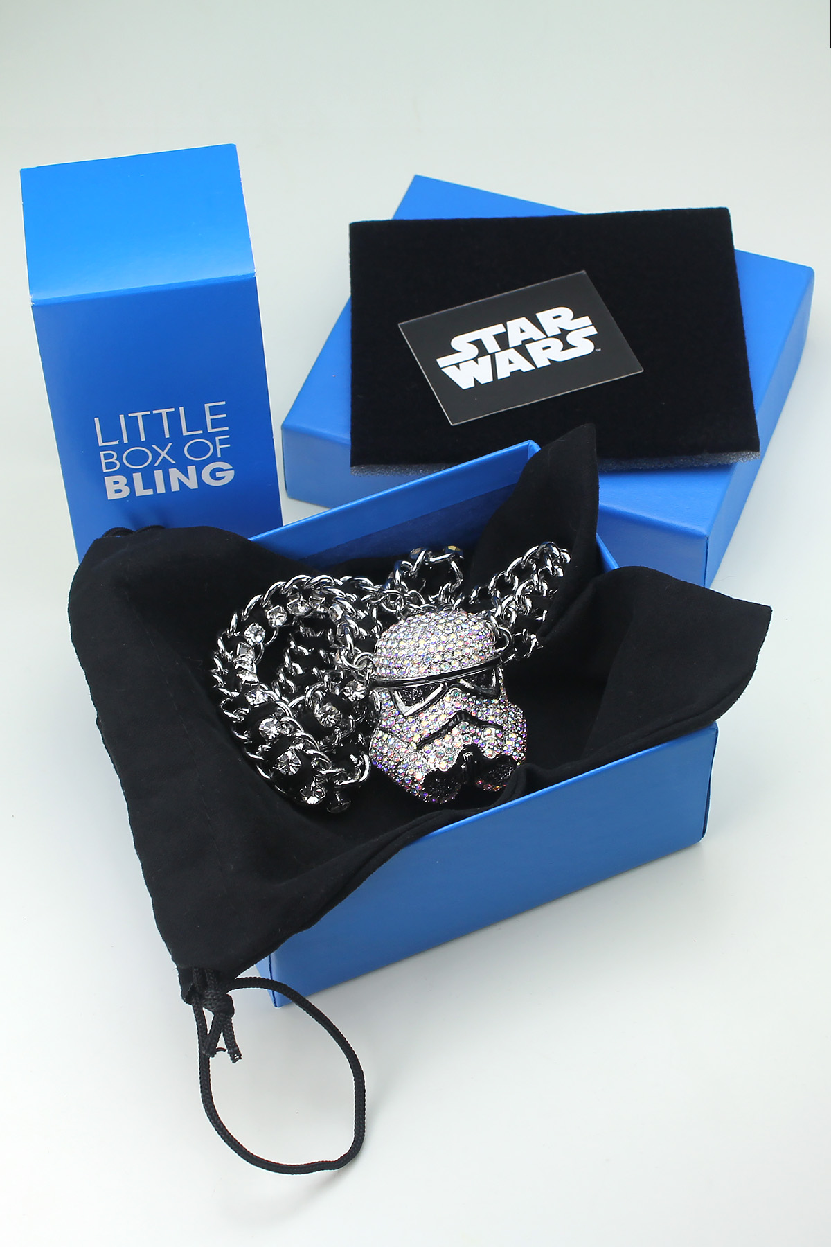 All of the items I bought came packaged in blue cardboard gift boxes. The each box has a removable lid, with an outer slip band featuring the text ‘Little Box Of Bling’. Inside the box the jewelry item is carefully packaged between two pieces of foam – the ‘top’ of each foam piece has a black velvet-type finish. Sitting on the top of the upper foam piece is a little black card featuring the Star Wars logo. The necklace also included a black fabric drawstring bag, which is a nice touch. I was really keen to see if the packaging included any information about the manufacturer of this range, so it was great to see that the back of the insert card notes these are made by SG@NYC, LLC. I have only come across this company once before this collection – they made the ‘long chain’ TIE Fighter necklace that was sold at Hot Topic back in October/November last year (read my review here).