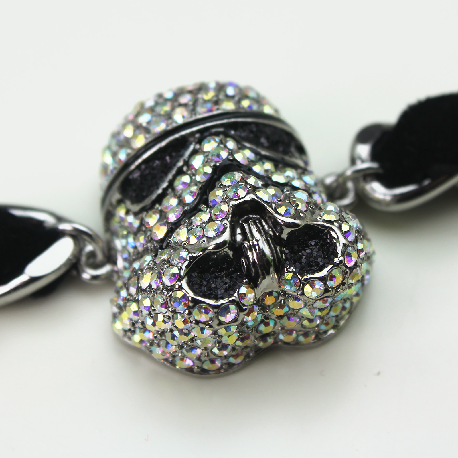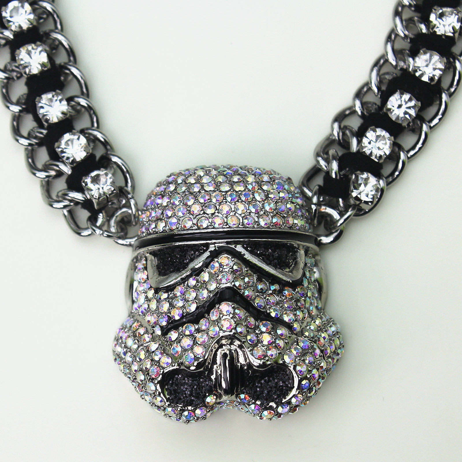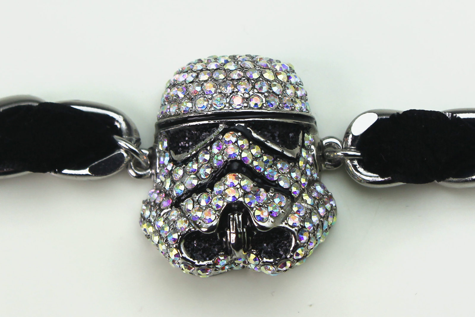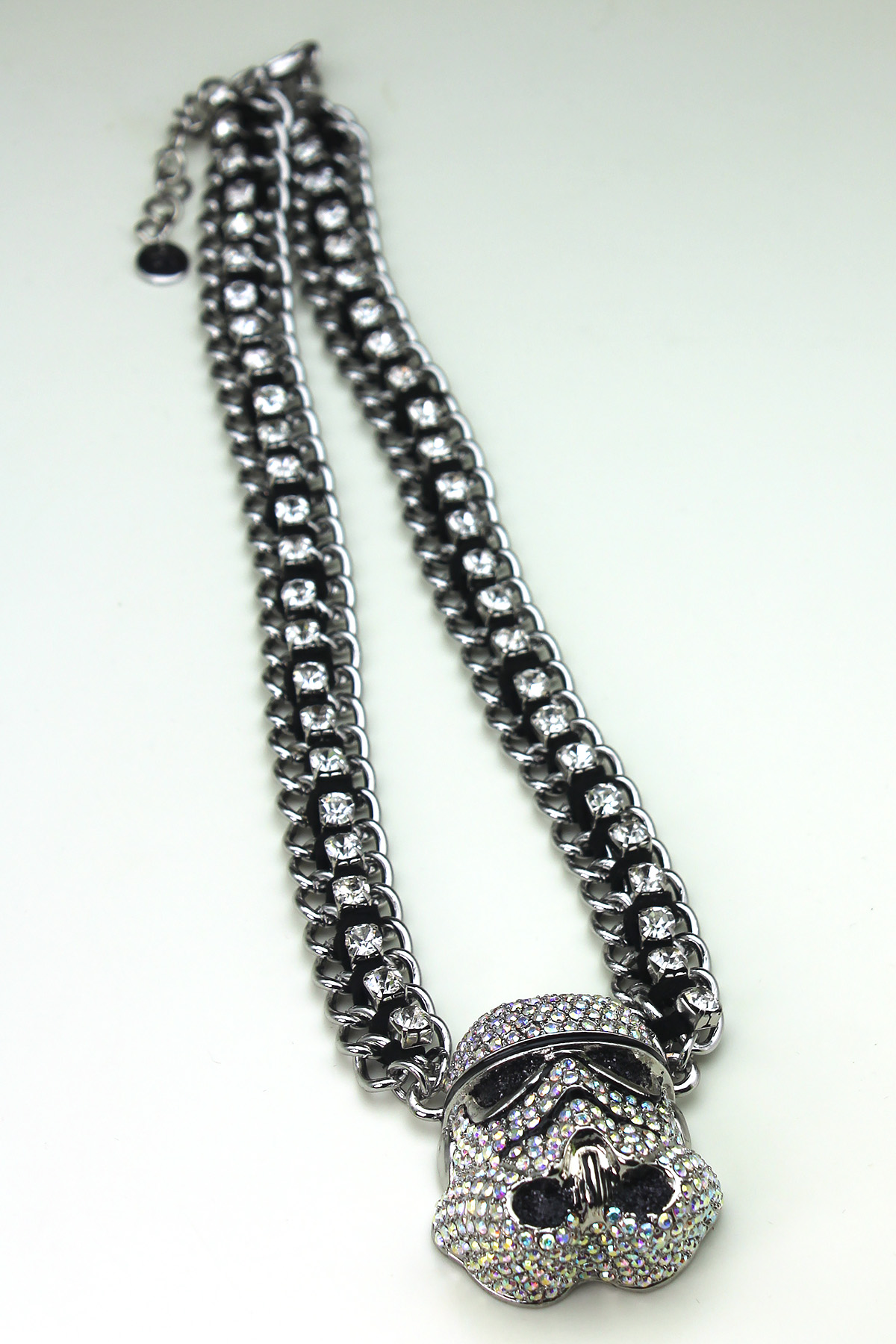 The necklace features a large metal Stormtrooper helmet pendant, accented with rhinestones that have a slight ‘rainbow’ sparkle. The ‘brow trim’ and ‘mouth’ details are highlighted with black enamel, while the ‘eyes’ and ‘chin’ areas are decorated with black glitter! The back of the pendant is hollow, to reduce weight, but it still has a bit of heft to it. The chain is made from several materials – two wide link chains, a large rhinestone strand, and a thin suede ribbon braiding them all together. The chain is attached to the stormtrooper pendant on both sides, so it does not ‘swing’ when worn.