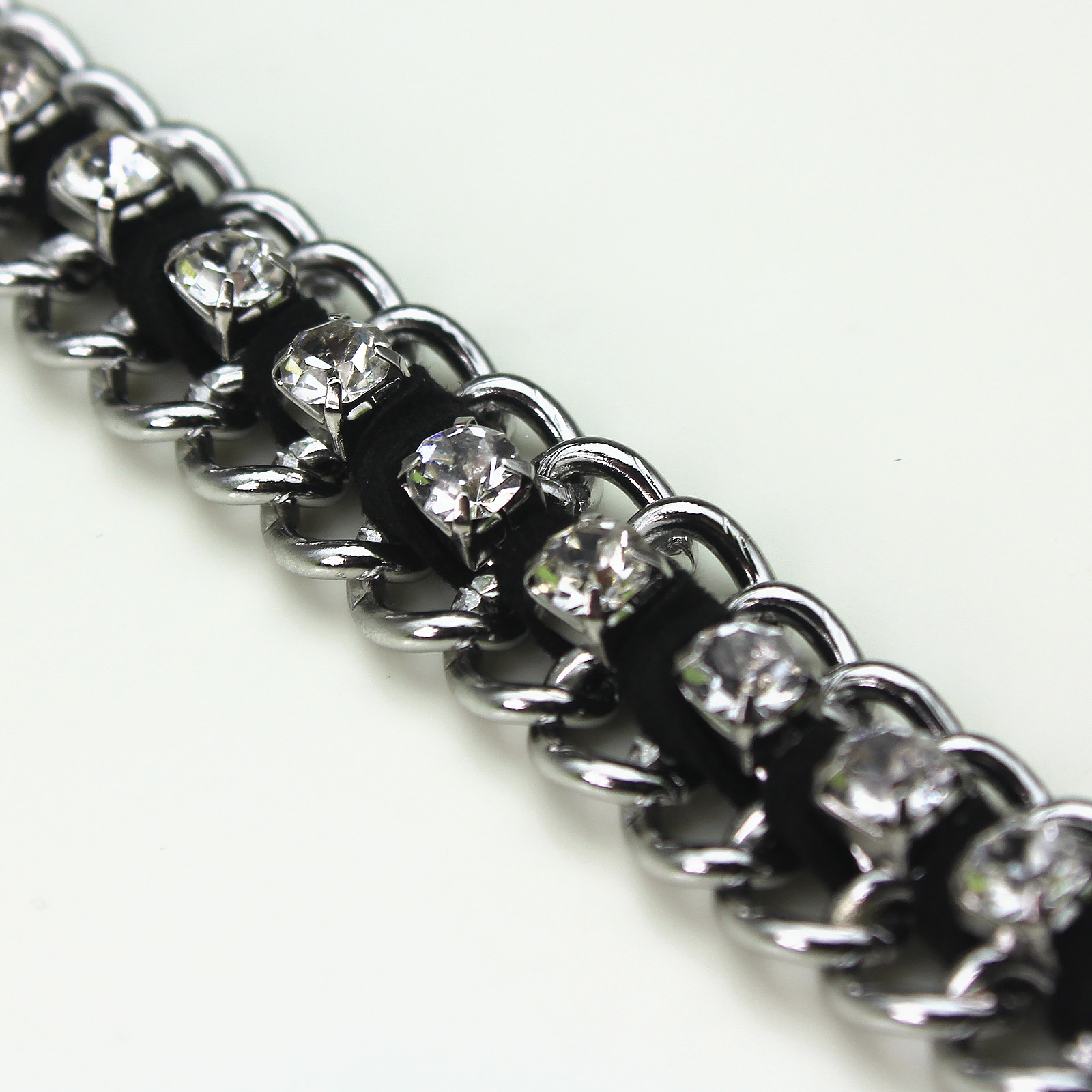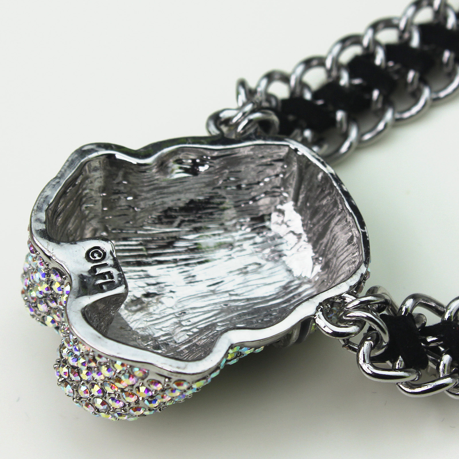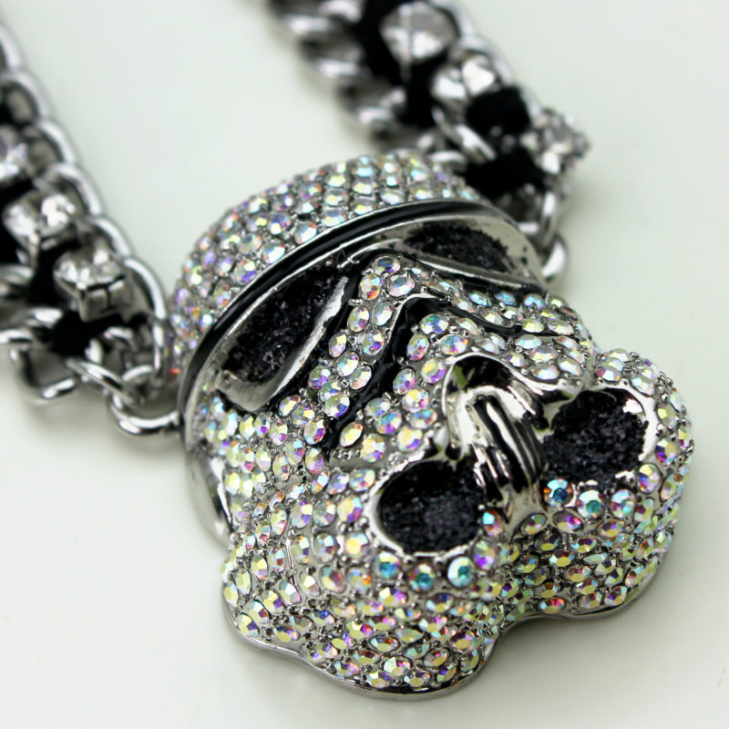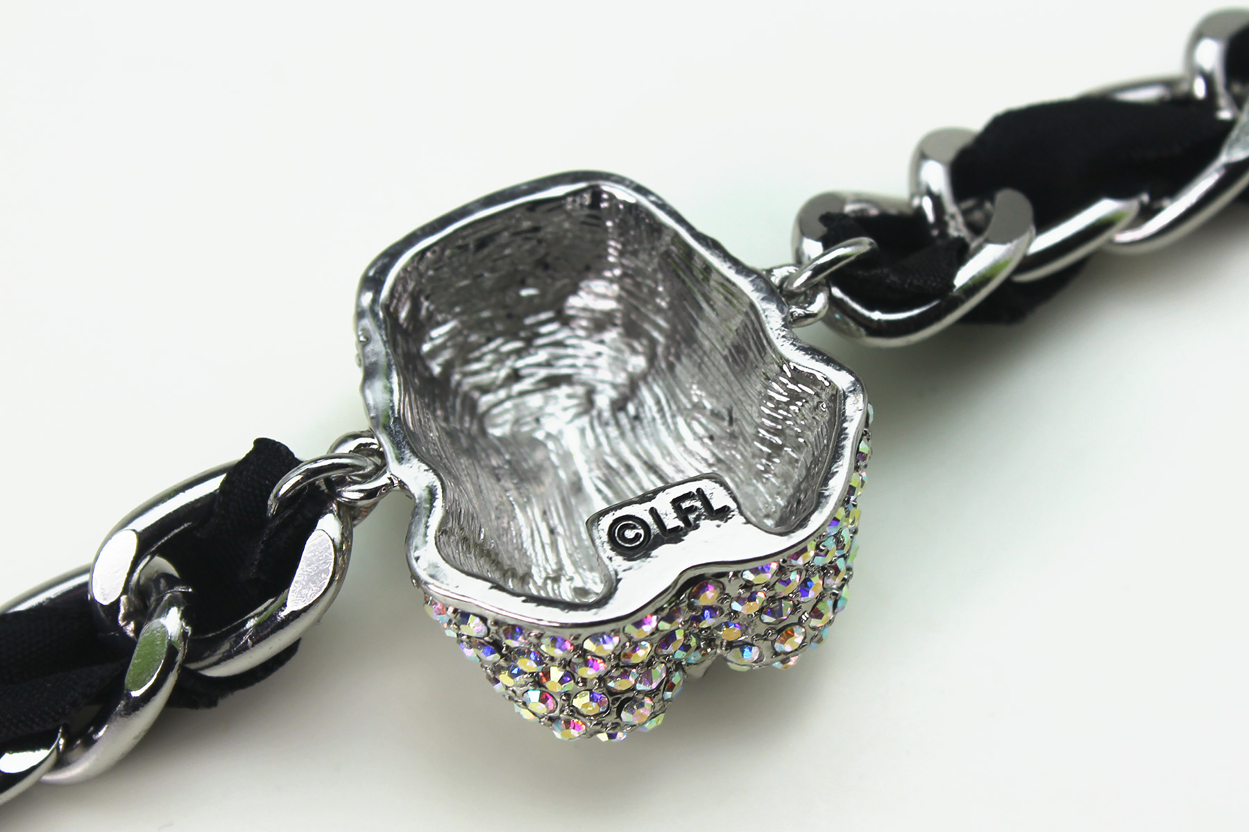 The necklace features a large metal Stormtrooper helmet pendant, accented with rhinestones that have a slight ‘rainbow’ sparkle. The ‘brow trim’ and ‘mouth’ details are highlighted with black enamel, while the ‘eyes’ and ‘chin’ areas are decorated with black glitter! The back of the pendant is hollow, to reduce weight, but it still has a bit of heft to it. The chain is made from several materials – two wide link chains, a large rhinestone strand, and a thin suede ribbon braiding them all together. The chain is attached to the stormtrooper pendant on both sides, so it does not ‘swing’ when worn.