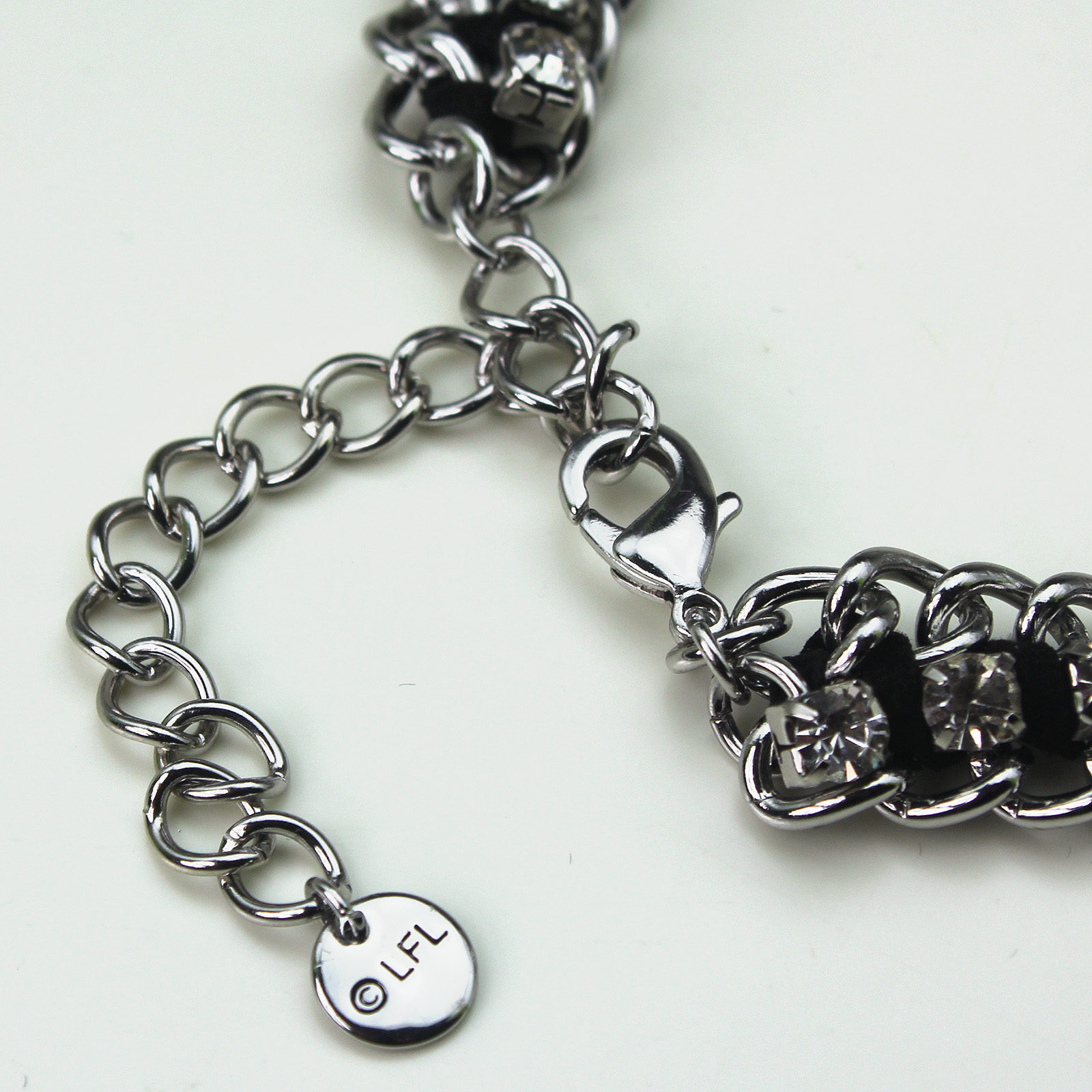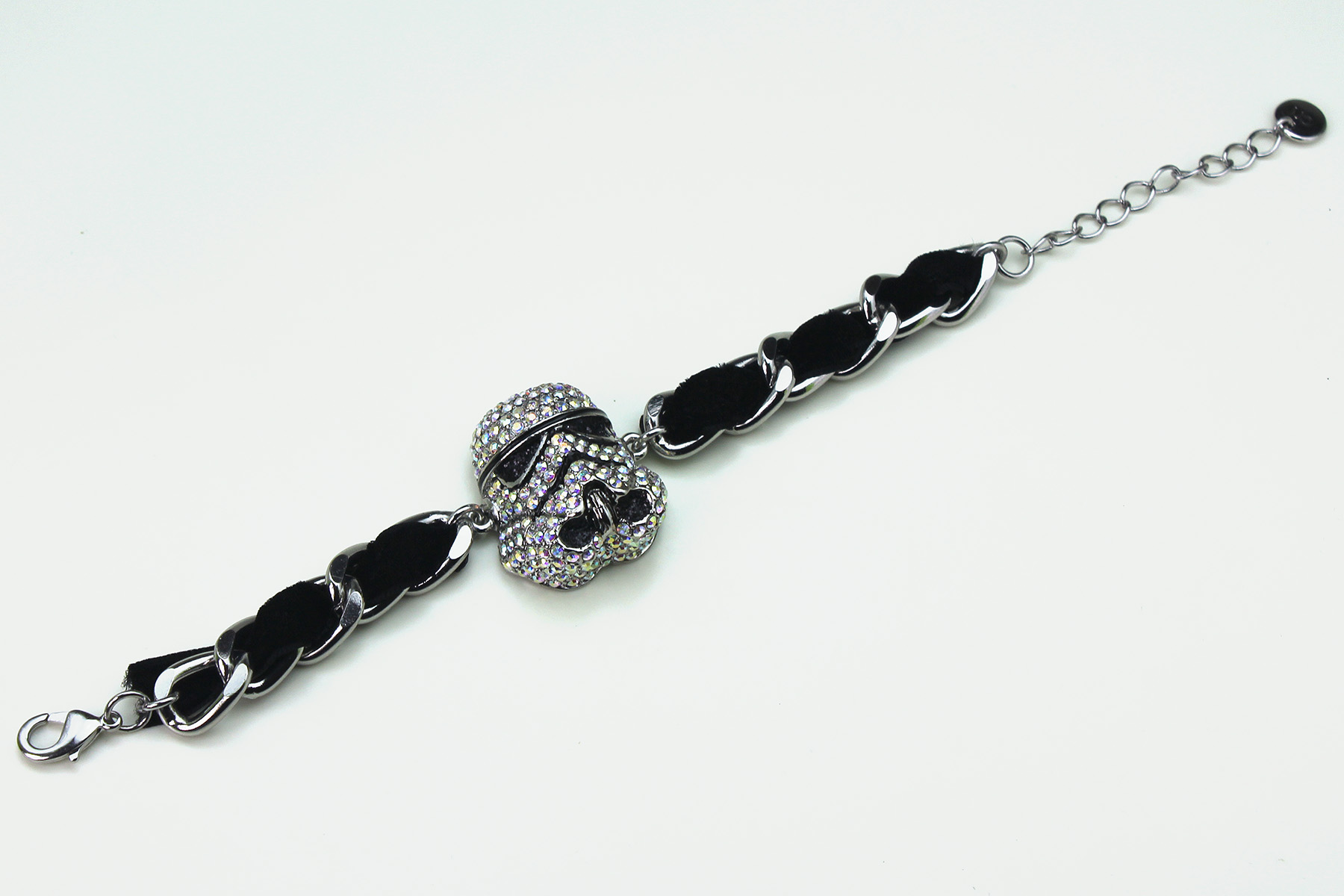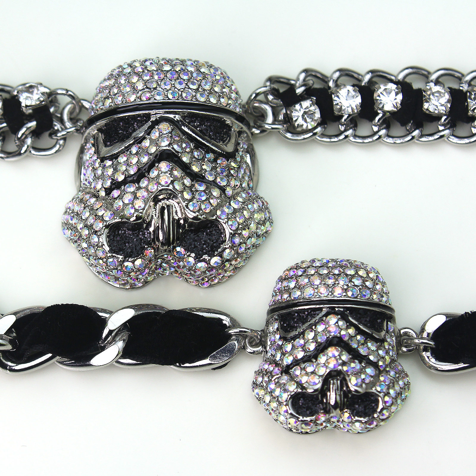 I was very interested to compare the necklace and bracelet together, as some coordinating jewelry sets use the same pendant sculpt – while these use the same rhinestones, the size of the helmet used on the necklace is a lot larger than the helmet on the bracelet. The stormtrooper helmet pendant on the bracelet measures approximately 2cm tall, 2.8cm across and 1.6cm deep (at the widest points) – this is approximately 2/3 the size of the necklace pendant. The back of both pendants features the standard ‘(c) LFL’ stamp, noting these are licensed items. The chains are obviously different (different link style, different size, and different black fabric accent), but similar enough in style for these to form a matching set that can be worn together.