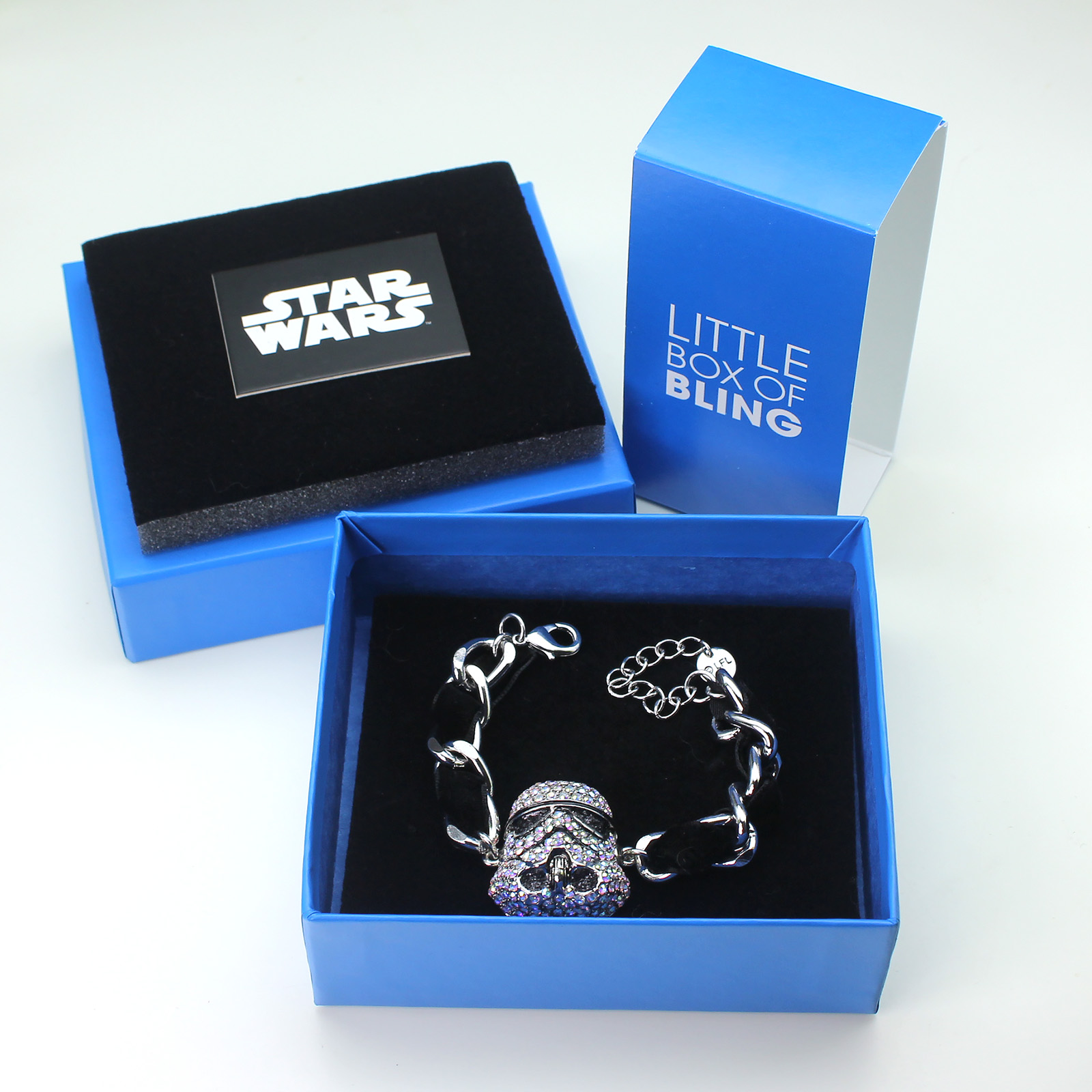 In November last year, HSN released a collection of ‘bling’ Star Wars jewelry. As HSN does not ship outside the US, or accept international credit cards, I was really frustrated to see such a fantastic collection released that international fans couldn’t purchase. An amazing friend in the US helped me purchase a few of my favourite items from the range, which I was able to pick up while visiting the US for the Run Disney Star Wars event in January (yay, saving on international postage). I am so excited to finally see these items in person, and of course photograph them for review. I was able to buy eight items from the range – today’s review features the ‘bling’ Stormtrooper pave’ silvertone velvet ribbon link necklace and matching bracelet (sold separately).