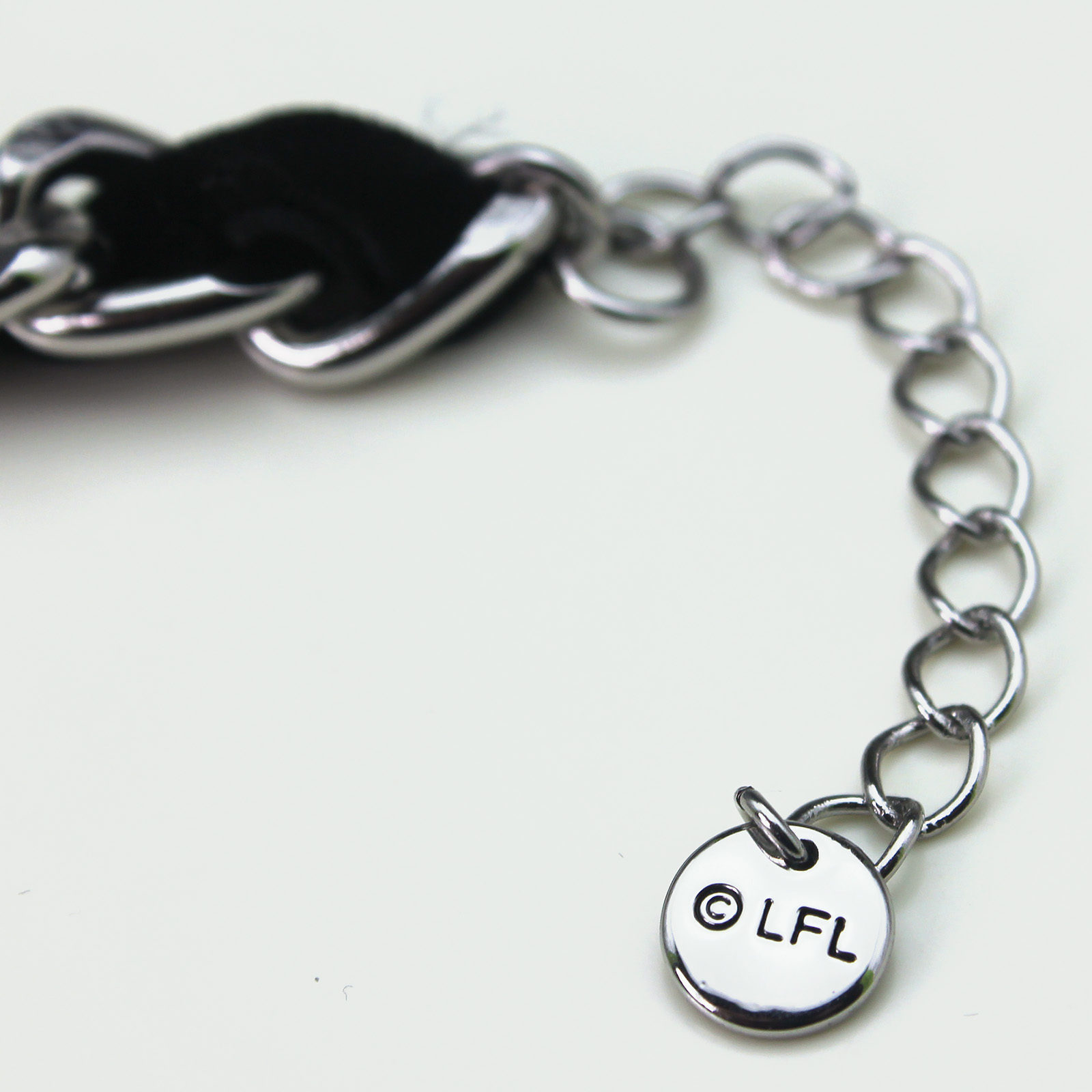 The matching bracelet also features a Stormtrooper helmet pendant with rhinestones, black enamel and black glitter details. The chain is a single strand of large link chain, with a black velvet ribbon woven through. Each end of the ribbon lengths are pierced by the hooks attaching the clasp, adjustment chain, and pendant, so it won’t come out. The ends of the velvet ribbon are raw edges – I’m a little worried about one end in particular possibly fraying, so I might see if I can seal it a little more with a tiny spot of glue. The bracelet chain measures approximately 17cm long (if measured as one continuous length, including pendant and clasp), with a further 5.5cm of a smaller link chain for adjustment – the clasp is a standard ‘lobster’ style. There is a small circular pendant at the end of the adjustment chain that features ‘(c) LFL’ stamped on one side, and ‘CN’ on the other (I have no idea what ‘CN’ stands for?).