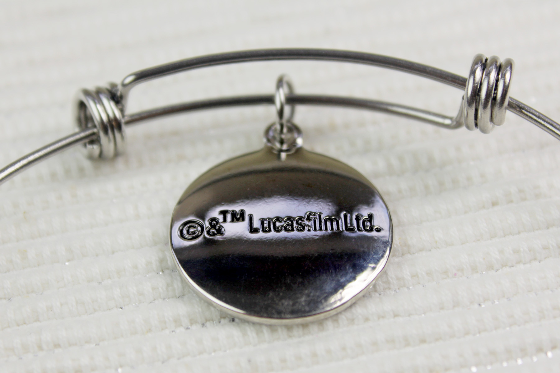 My bracelet was purchased (on sale) from Kohl’s, so the packaging differs to those sold elsewhere. The bracelet came packaged in a nice black and white cardboard gift box. The top lid is black, and features the Star Wars and Disney logos printed in white. Lifting the lid, the bracelet is held to the cardboard insert by 3 white ‘twisty ties’. The bracelet is made from stainless steel, and features 4 pendants – 1 large main charm, and 3 small additional charms.