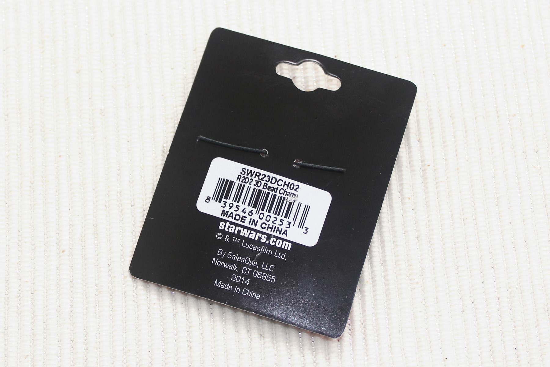 The charm comes on a cardboard backing card, featuring the Star Wars logo on the front, and the standard Body Vibe/Sales One information on the back. The charm is attached to the card with a small black ‘twisty tie’, threaded through the bead. The charm is made from 316L surgical Stainless Steel, and features a 3D sculpt of R2-D2 in his standing ‘2-leg’ mode.