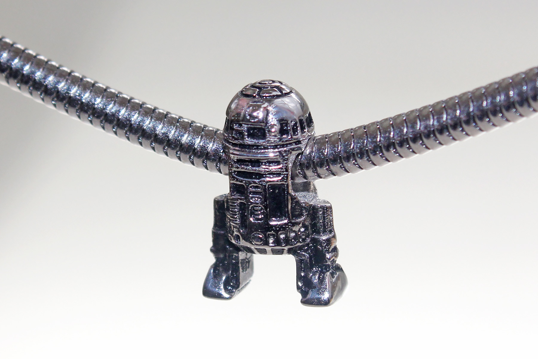 The bead charm measures approximately 17mm high, 10cm across and 6mm deep. Below is a photo of the R2-D2 bead threaded on a stainless steel necklace by Body Vibe (sold separately). You can already see how the side cut-outs are less distracting to the design. The Body Vibe x Star Wars charms can fit most common charm bracelet brands – I own a Pandora bracelet, and these charms fit nicely.