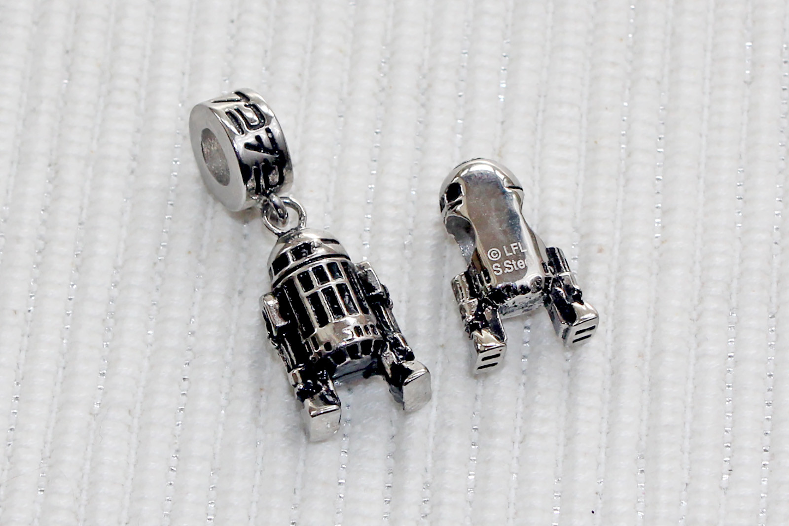 It is interesting to compare the bead charm to the dangle version. The most obvious difference is the flat back of the bead charm, but also the dangle charm does not have details on the bottom of R2-D2’s feet. Otherwise they appear to based on the same design – they are the same height and width. My own dangle charm has a touch more antiquing, but that tends to vary a bit charm by charm.