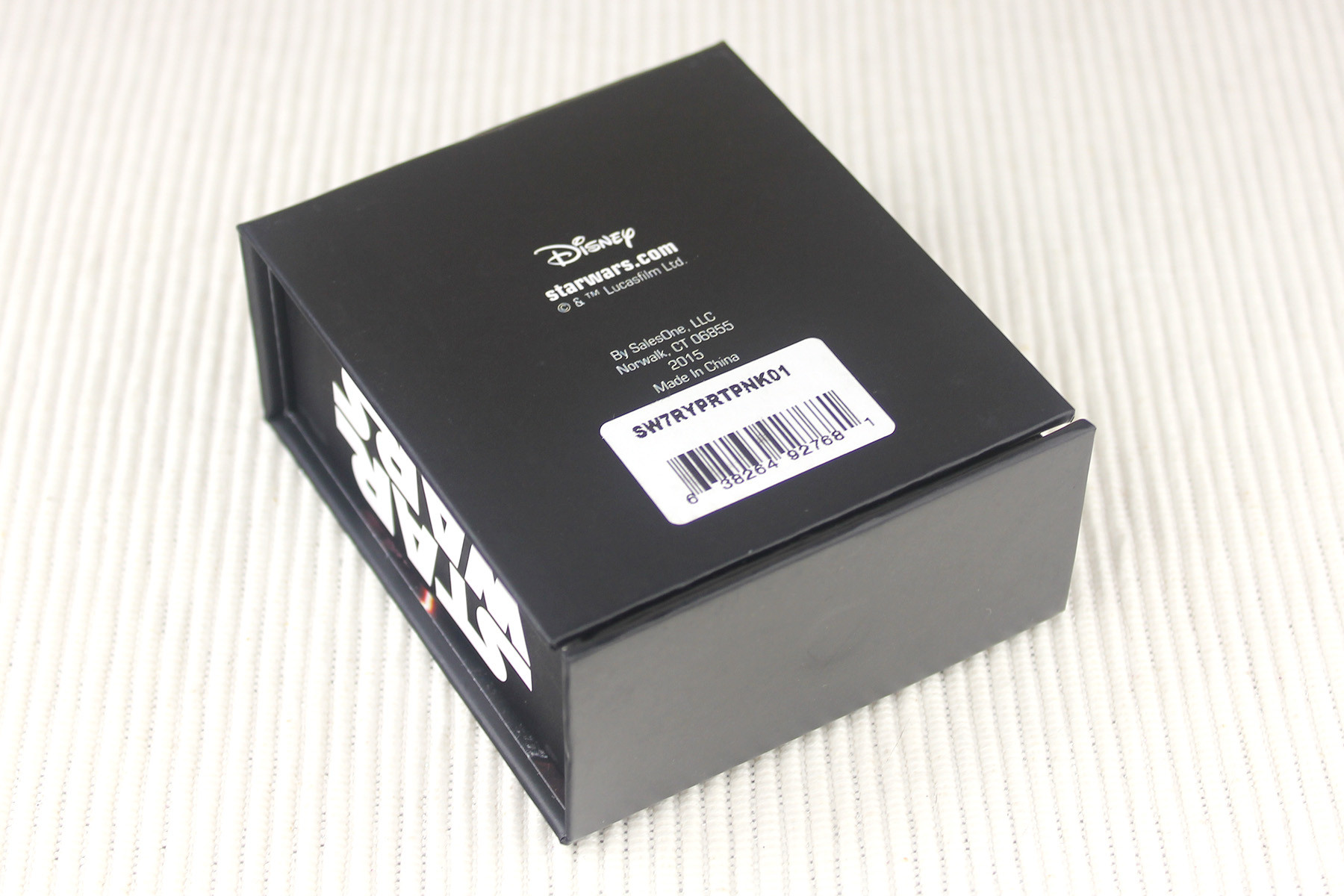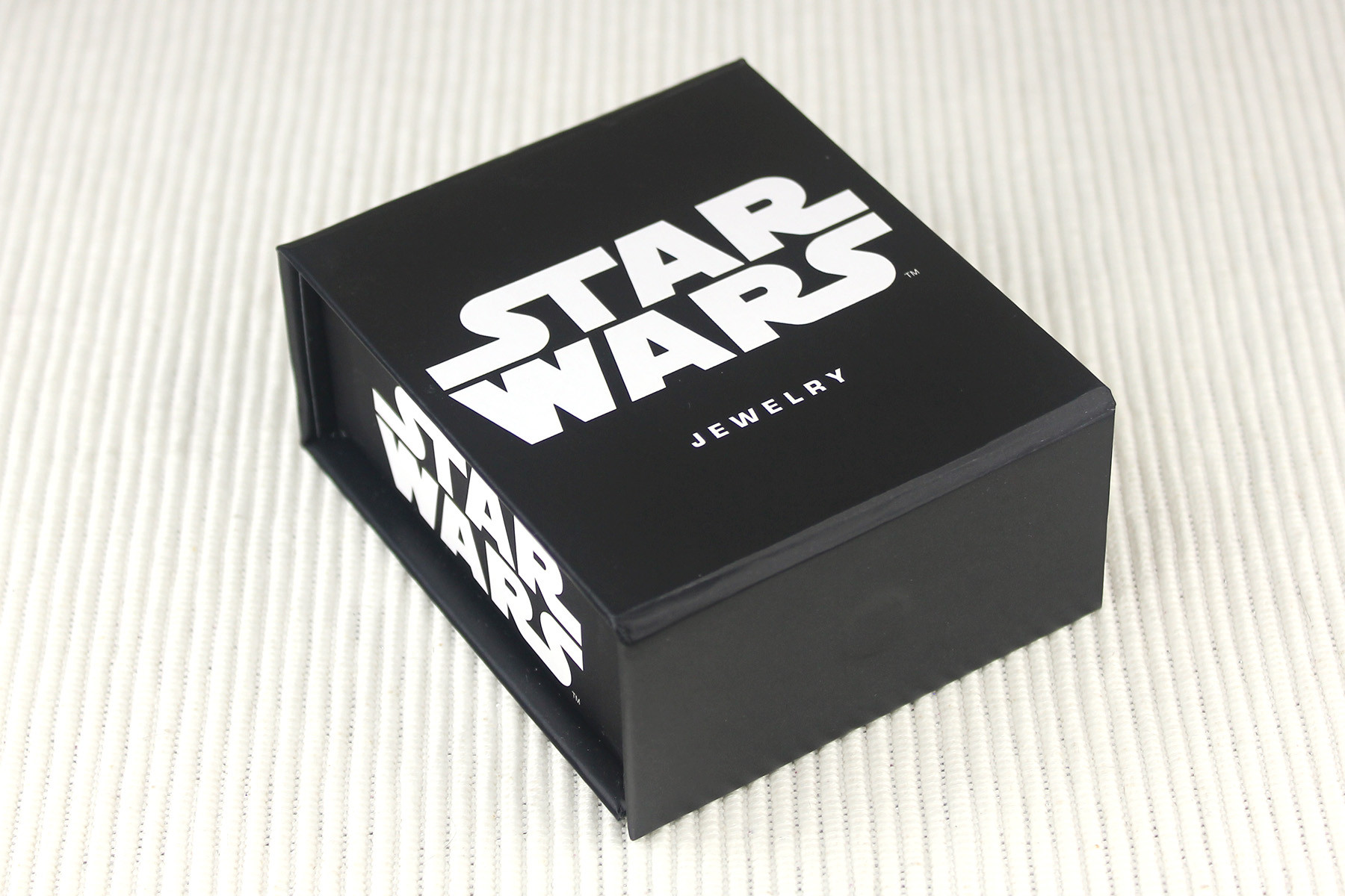 The necklace came in a nice black gift box, with the Star Wars logo on the outside. Opening the magnetic flap reveals The Force Awakens artwork inside the top lid, with the necklace on a backing card inside. The pendant had a small piece of clear plastic wrapped around it for protection, while the rest of the chain length was tucked behind the card insert.
