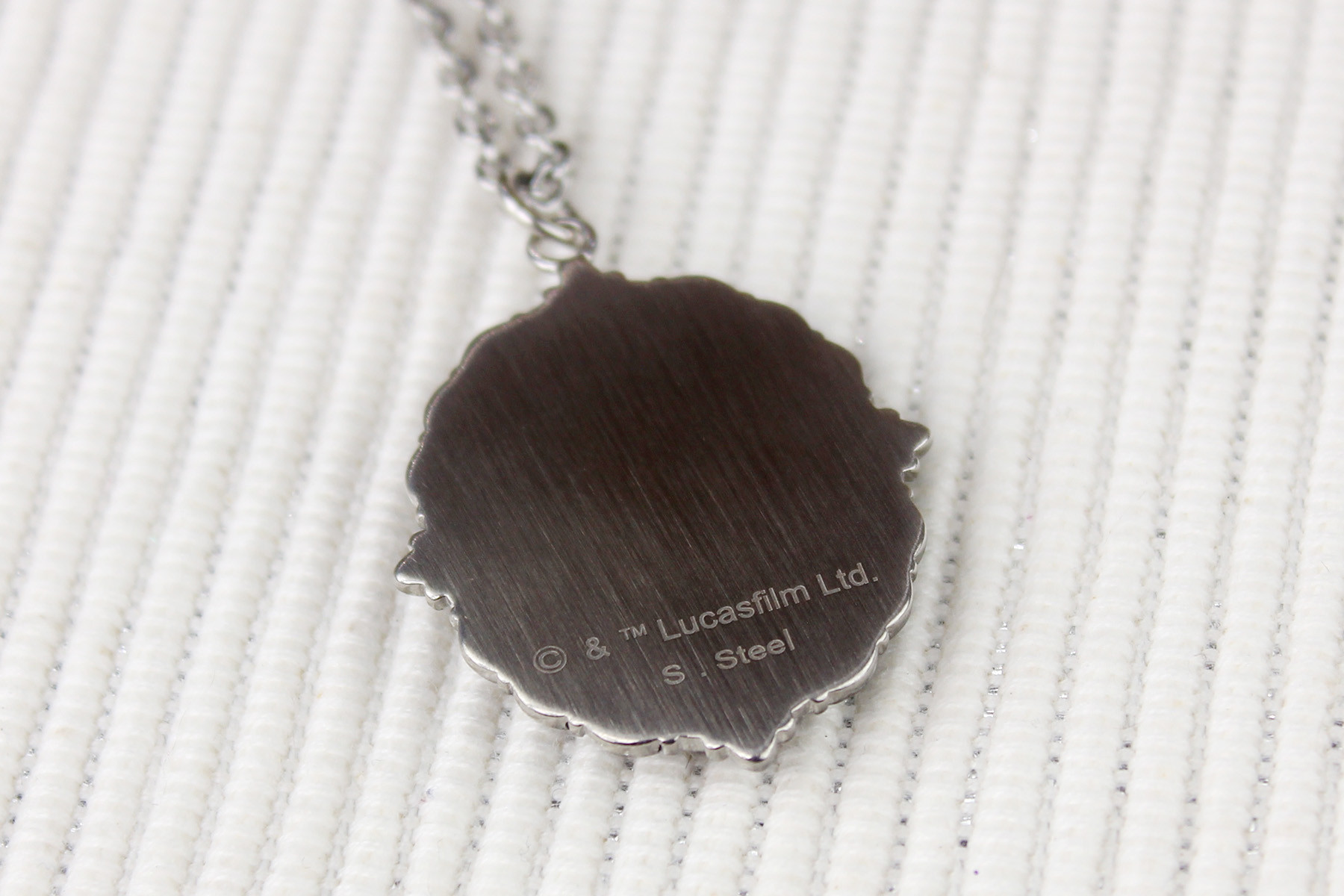 The front of the pendant features the printed image under a clear plastic dome covering, and fixed in a silver tone cameo setting. The scrolling border design is accented with black antiquing, which helps highlight the details. The back of the pendant is flat with a brushed finished, and etched with the standard copyright text ‘© & ™ Lucasfilm Ltd. S. Steel’ noting this is a licensed item, and made from Stainless Steel.
