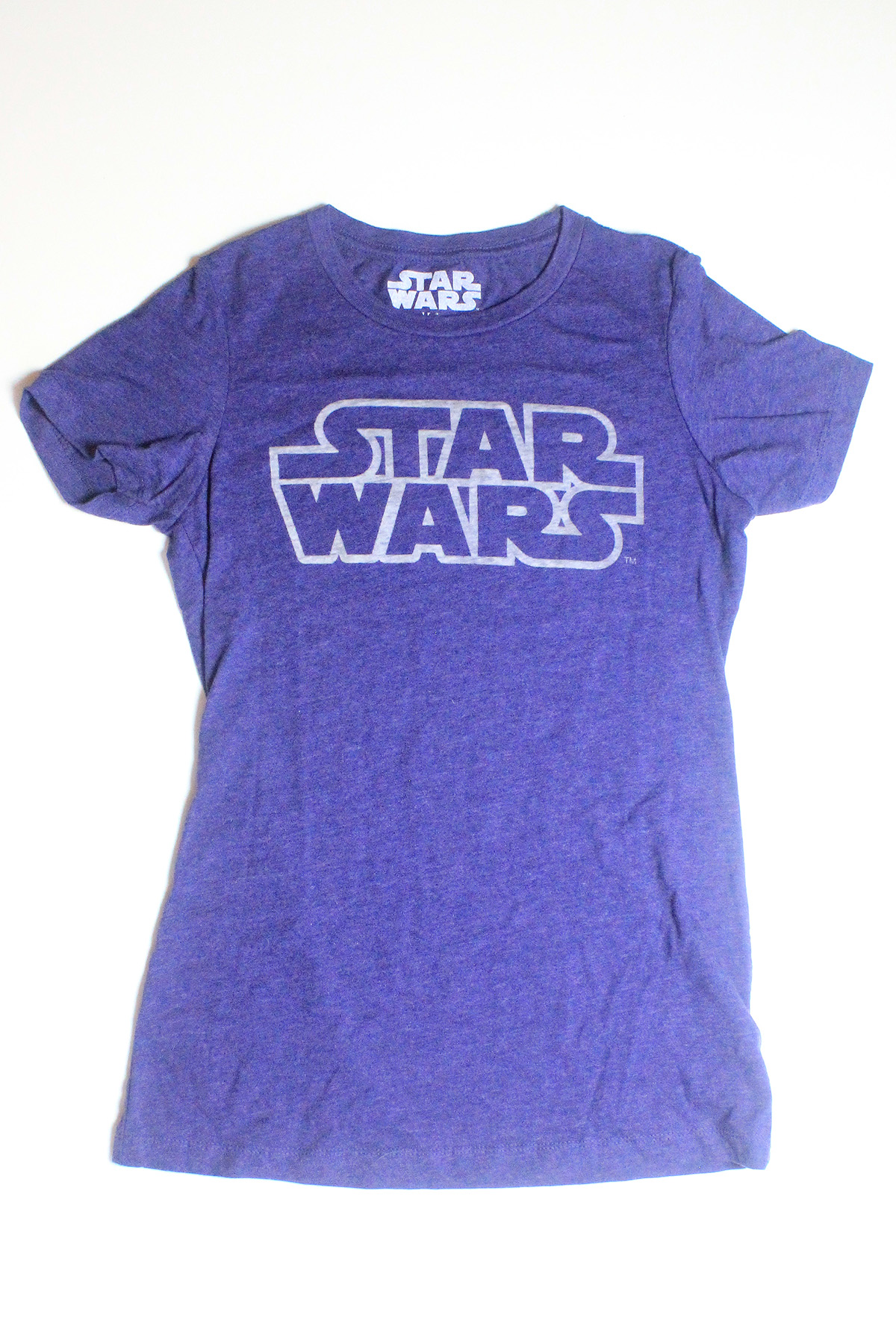 I was of course keen to compare this new version to my original burnout t-shirts. The new version uses the burnout logo from the purple version, with the shirt colour of the blue version (new version on the left/top in the photos below – they photograph slightly differently, but do appear the same colour in person). The fabric is the same composition across all three shirts, though interestingly the new t-shirt’s burnout section is less ‘see through’ compared to the older versions. The back of the older shirts also features the older Ahsoka Tano inspired Her Universe logo. Her Universe doesn’t seem to use this logo prominently any more, perhaps why the back of the new t-shirt is blank. My original burnout t-shirts are size medium, which both measure approximately 43cm across the chest (underarm to underarm). One might question why I bought three quite similar t-shirts, but I really like my mini-collection. Some days the classic Star Wars logo is all you need.