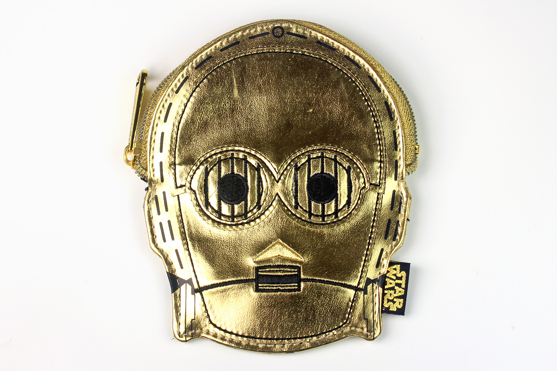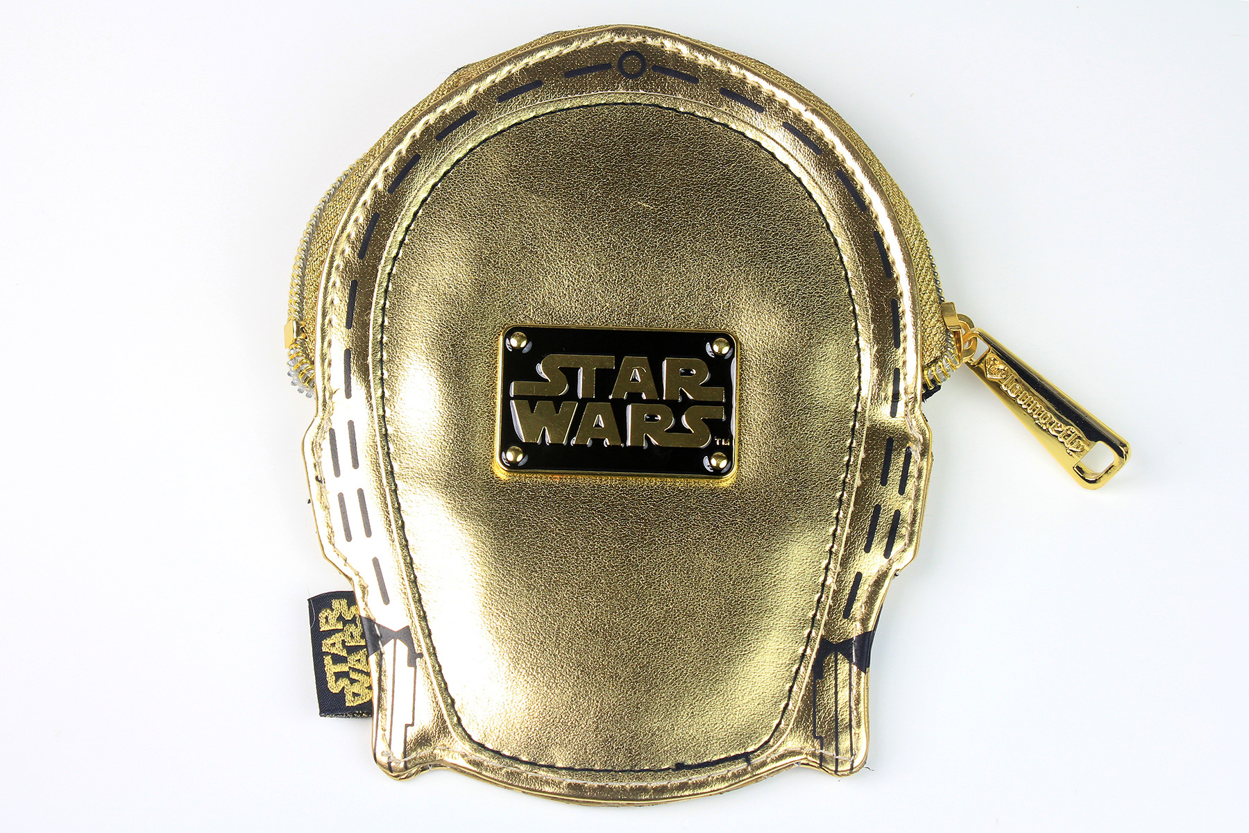 I love the range of Loungefly x Star Wars coin purses, but as I don’t use cash much, I can’t really justify buying all the ones I like (at least at full price). During a regular ebay search, I came across a listing for a C-3PO coin purse for $7.99 – it’s regular retail price is US$20 direct from Loungefly so I couldn’t resist grabbing it. It’s the perfect match for my R2-D2 handbag from the same collection! The coin purse is made from metallic gold faux leather with embroidery and appliqué details, and features the standard Loungefly x Star Wars touches, like the black printed Star Wars logo lining fabric and glossy metal logo plaque on the back. It measures approximately 12cm wide and 14.3cm high, a good size for holding cash and even cards. I’m very happy to finally have a C-3PO to accompany my R2-D2 🙂