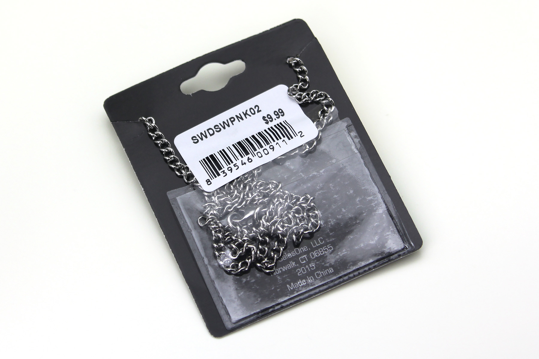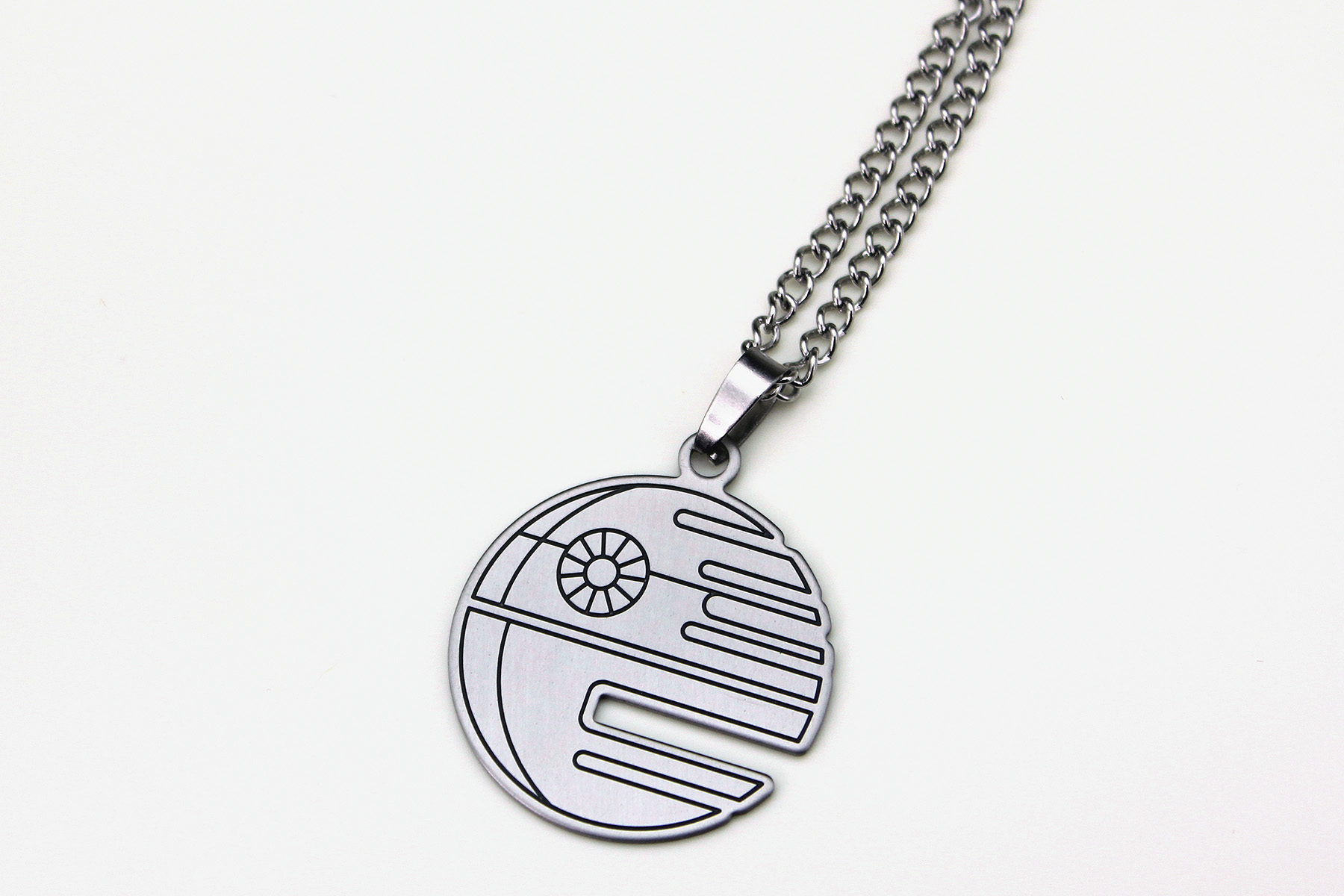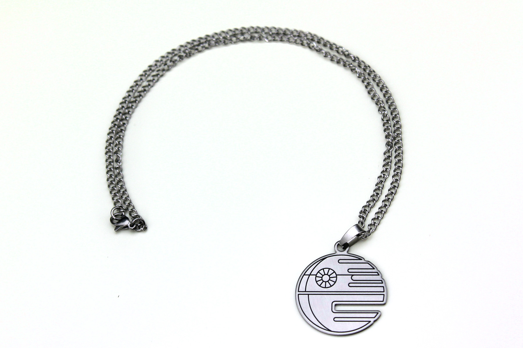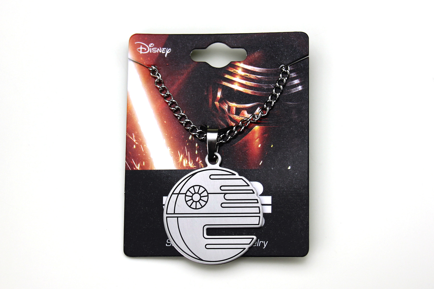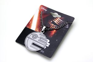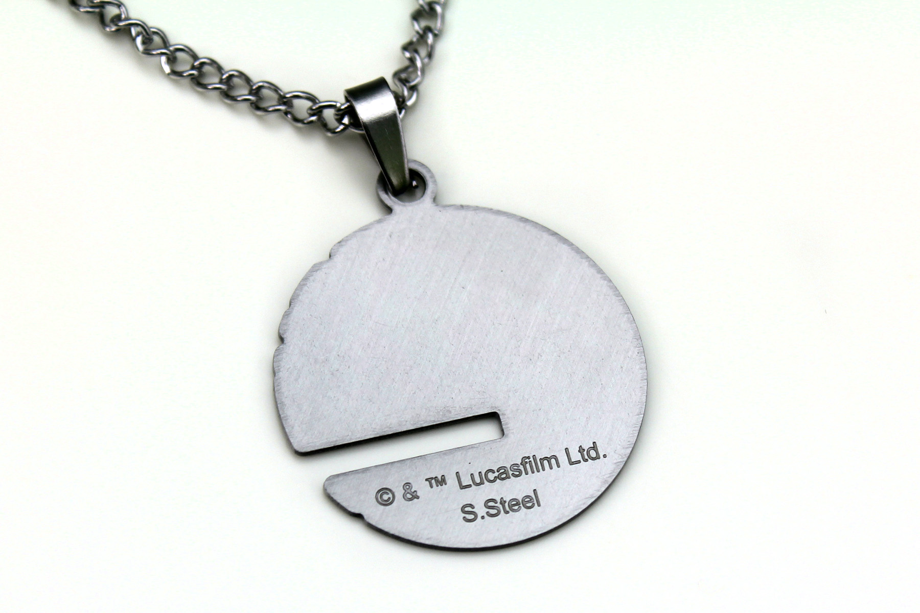 The necklace came packaged on a branded cardboard jewelry card, with the chain kept nicely in a small plastic pouch on the back. The Death Star cut out pendant necklace is made from stainless steel, and features a flat ‘disc’ Death Star pendant. The Death Star is of course the second version from ‘Return Of The Jedi’ – the right side of the pendant features a cut out as an added detail to the black etched ‘line art’ design. The thin pendant is nice and lightweight, but not flimsy – the back is etched with the standard copyright information ‘(c) & TM Lucasfilm Ltd. S.Steel’. The pendant measures approximately 3cm across, while the non-adjustable chain measures approximately 47cm long, and closes with a standard ‘lobster’ style clasp.