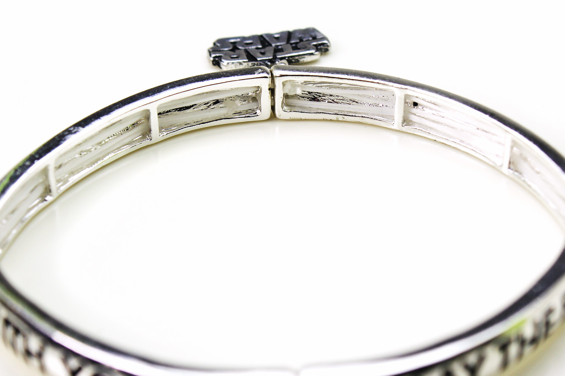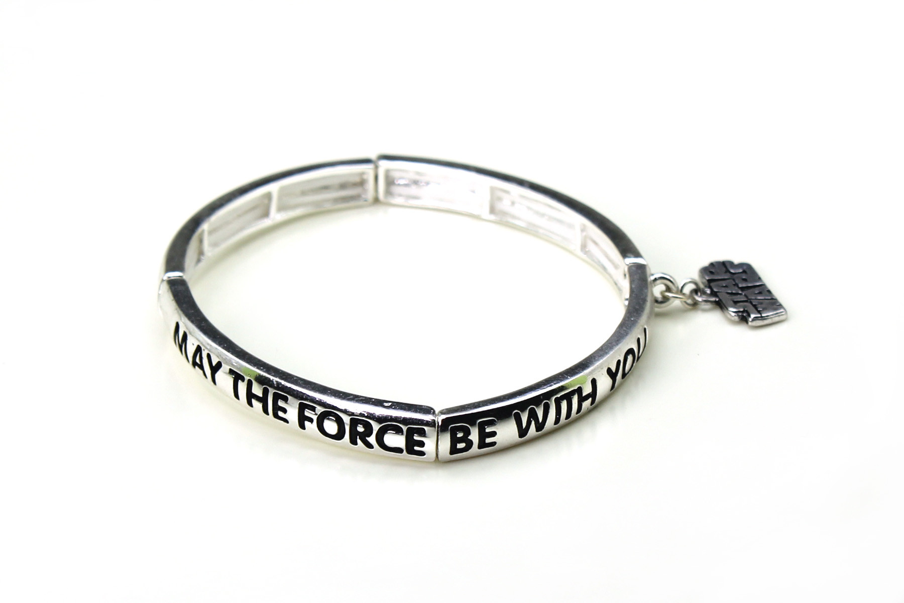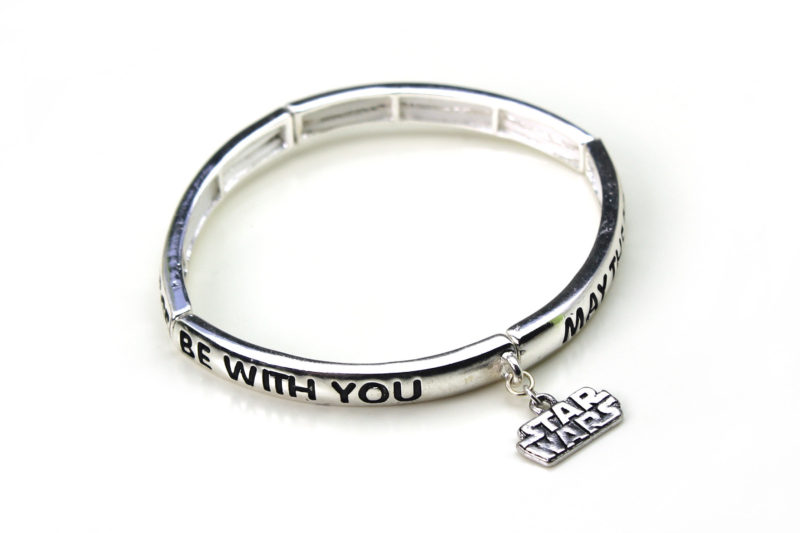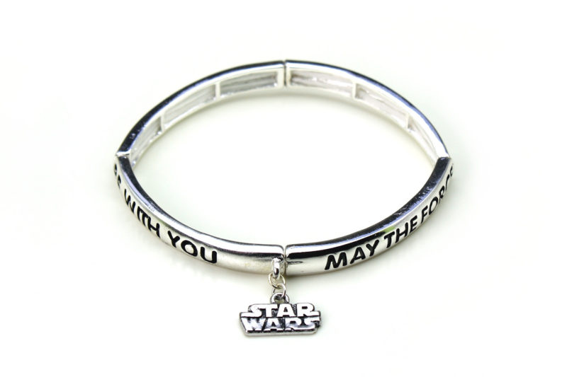 The ‘May The Force Be With You’ bracelet features four segments of silver-tone metal, held together with bands of elastic. The classic Star Wars quote ‘May The Force Be With You’ is featured twice – stamped into the metal segments, and highlighted with black. The silver-tone metal has a nice shiny finish, which really helps the black lettering stand out. I really like that the quote is used twice, so there is very little blank space – bracelets tend to rotate when worn, so this ensures the featured quote is always visible.