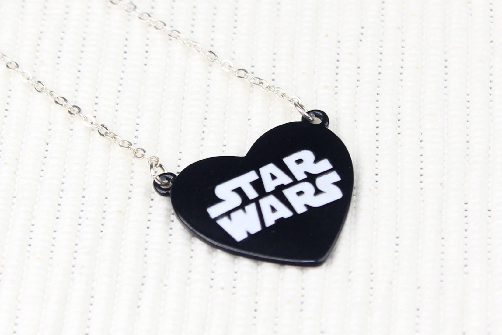 The necklace features a heart shaped black pendant, with a recessed Star Wars logo on the front, filled with white enamel. I did notice a few of these necklaces had slightly untidy white enamel sections, so it helped that I was able to choose one in person, just to check. The pendant features two rings on each upper side, to attach to two silver-tone chains. This ‘two chain’ style of necklace means the pendant doesn’t swing when worn – also, having a central hanger ring would hide the top of the heart, so I much prefer having the rings at the side. The ‘heart’ shape isn’t often used for Star Wars necklaces, outside of ‘best friend’ style split pendants, or else it features a specific character within the heart – I love the use of the heart for just the Star Wars logo, as it covers everything!