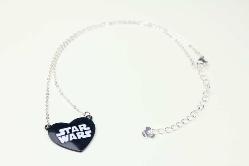 Today’s review features the Disney x Star Wars logo heart necklace. During my visit in January, the necklace was priced at US$11.99 each (plus tax), in Disney’s ‘yellow’ jewelry price category. Neither the necklace or the tag carry any mention of the material the chain or pendant is made from, so I’m not sure. Unfortunately this necklace isn’t available from the online Disney Store, but try checking eBay as there are sellers who often stock park-only merchandise.