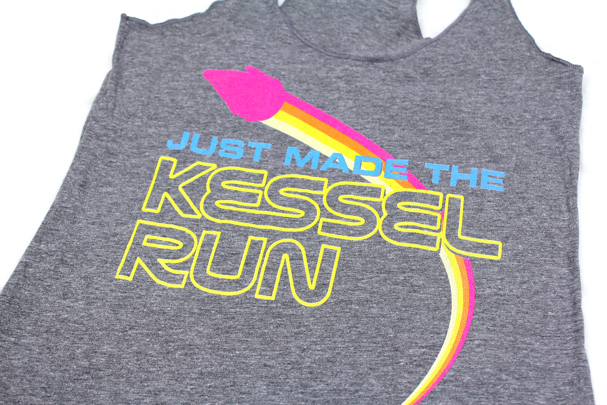 The front of the tank top features a colourful print of the text ‘Just Made The Kessel Run’, with the silhouette of the Millennium Falcon flying by. As this is part of the Solo A Star Wars Story range of designs, the Millennium Falcon seen here is Lando’s, with the escape pod filling in the front ‘mandibles’.