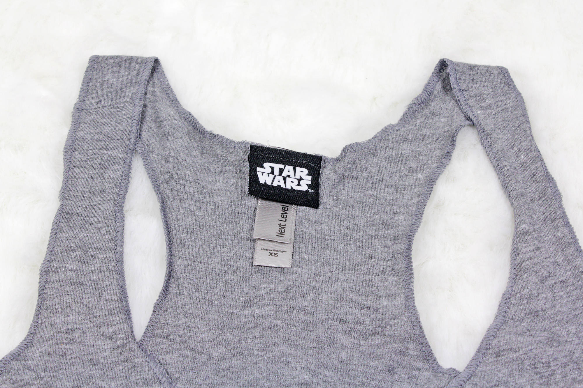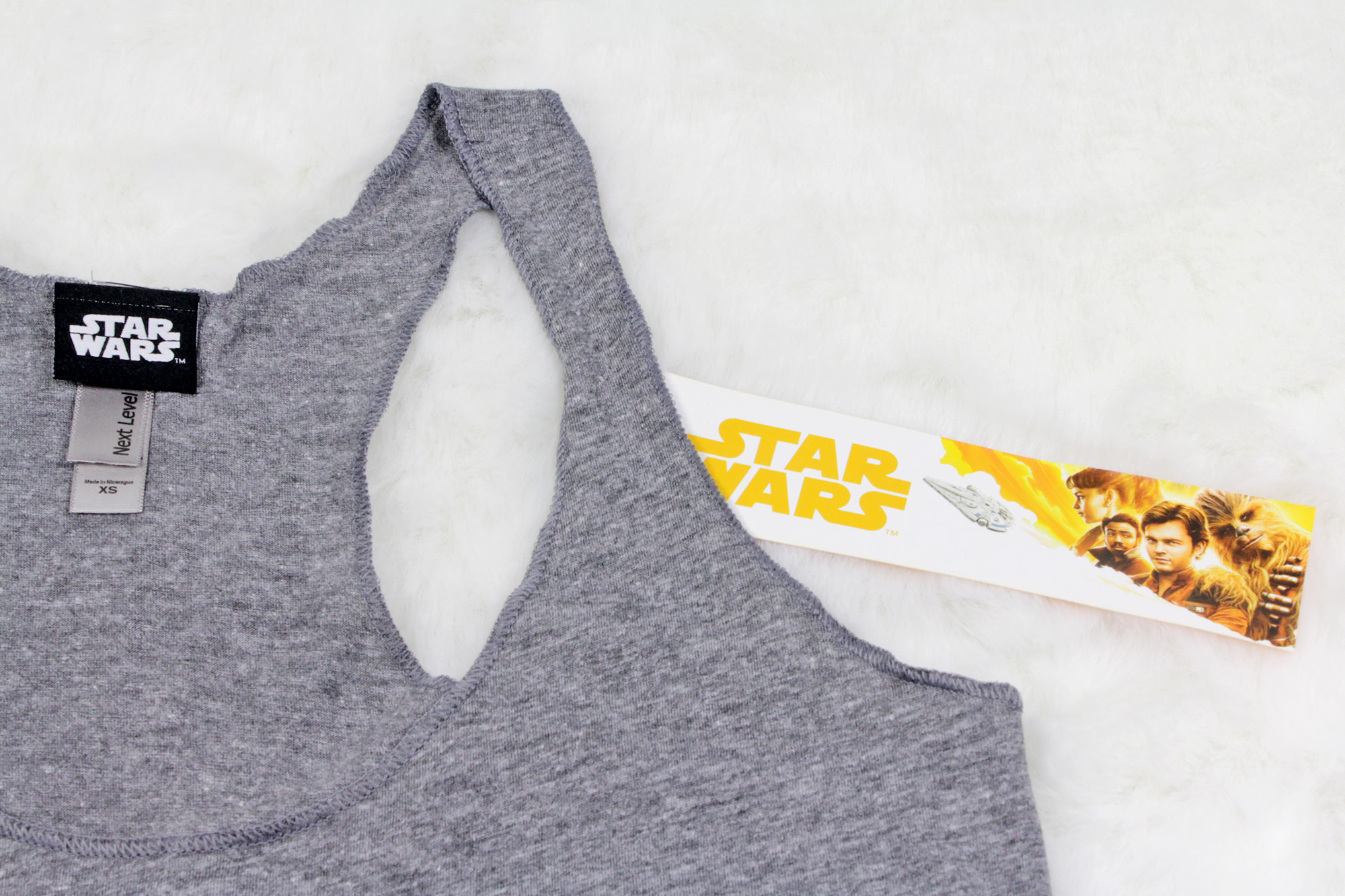 The tank top came with a Solo A Star Wars Story cardboard tag, but in this case, the tag wasn’t attached with the usual thin plastic attachment. The heather grey fabric is 50% polyester / 25% cotton / 25% rayon – it is nice and soft, with a light feel. This tank top is great for warmer, summer weather – or as a fun Star Wars workout top. Personally, I bought this top for my jogging runs, and becuse you know, The Kessel Run(way) 🙂