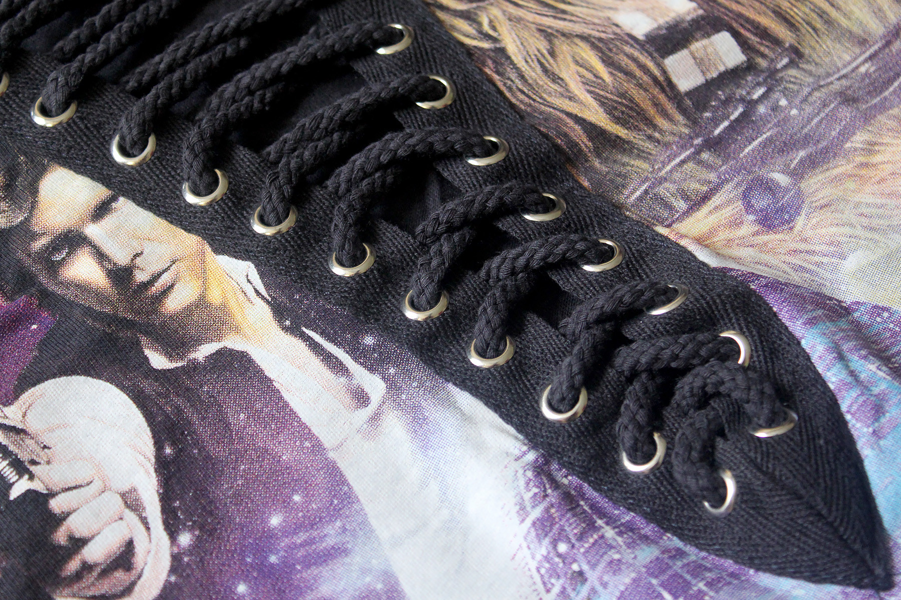 The front print features the Star Wars logo, Han Solo, Chewbacca, the Death Star, and a row Stormtroopers, all against a galaxy style background. The designers chose a really good print to use with the lacing insert – just enough of Han and Chewbacca’s faces are left, so it looks as if they are jumping out from behind the insert. The Star Wars logo is mostly removed/hidden by the insert, in a way that reminds me of magazine titles partially covered by the main cover image – the font/logo is so recognisable you only need to see part of it to know what it says.