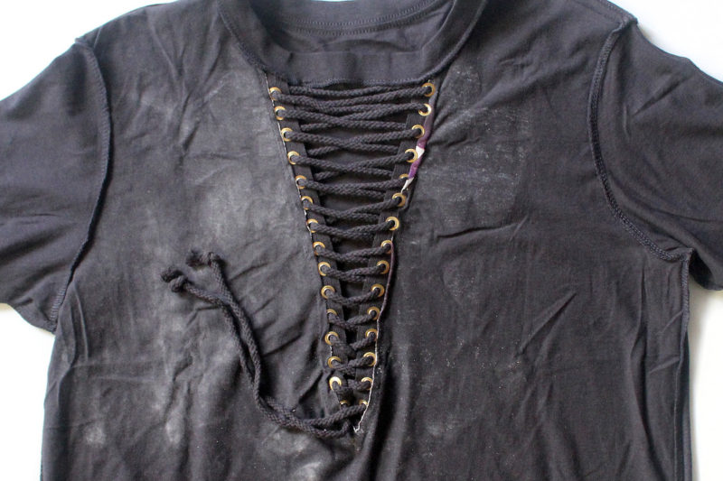 The t-shirt still has the standard neckline, so the laced section can’t open too far. Of course, if you want a more open look, you can cut out the neckline strip from across the top of the insert. The lacing braid is not sewn into the top, so if you wish, you can replace the braid with something of your own choosing, like a different colour braid, or ribbon.