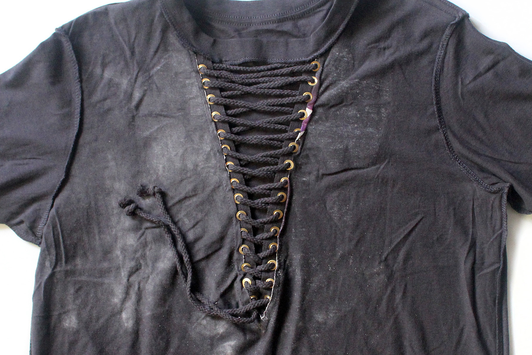 The t-shirt features an all-over Star Wars print on the front, with a lacing insert at the neckline. The insert is cut into the front of the tee (that is, not sewn on top), so it will show your skin/garments underneath. The v-shaped insert has 15 silver-tone metal eyelets on each side (30 in total), with black braid laced between them.