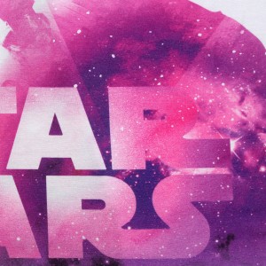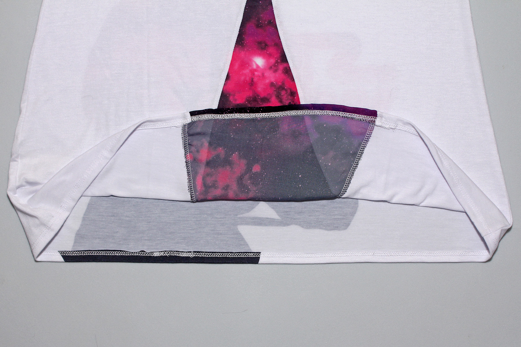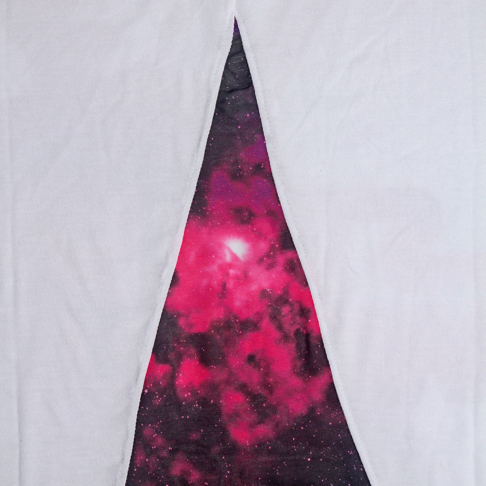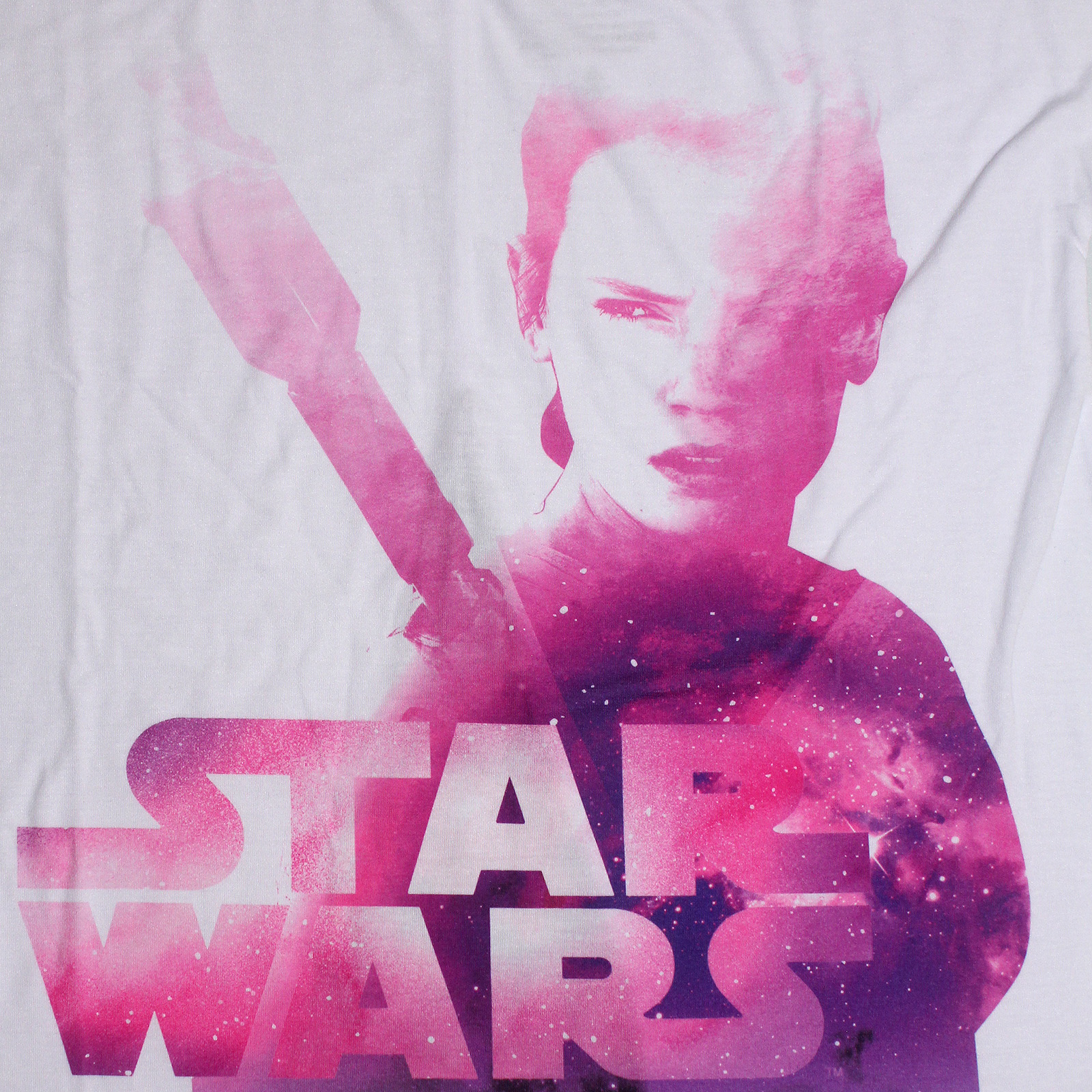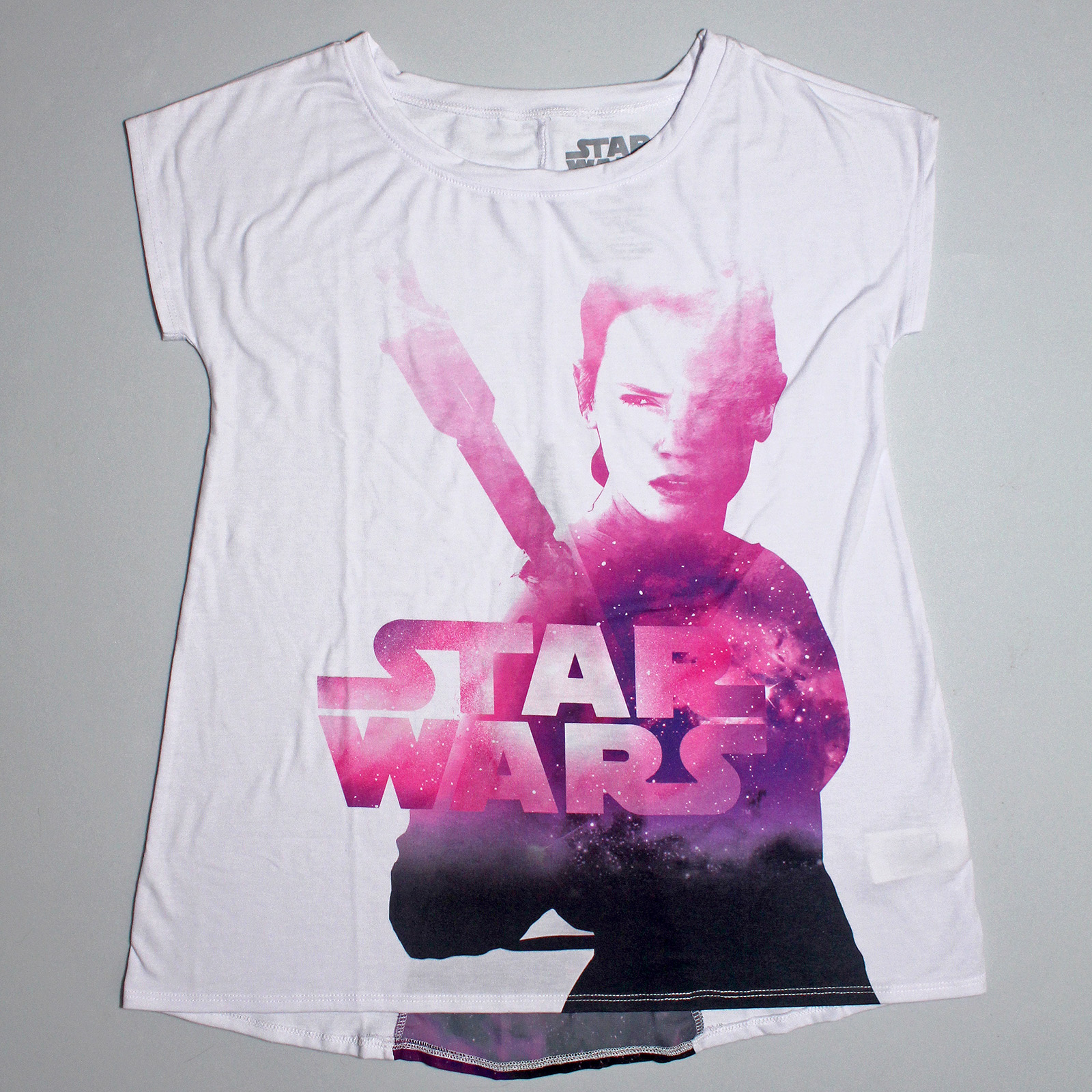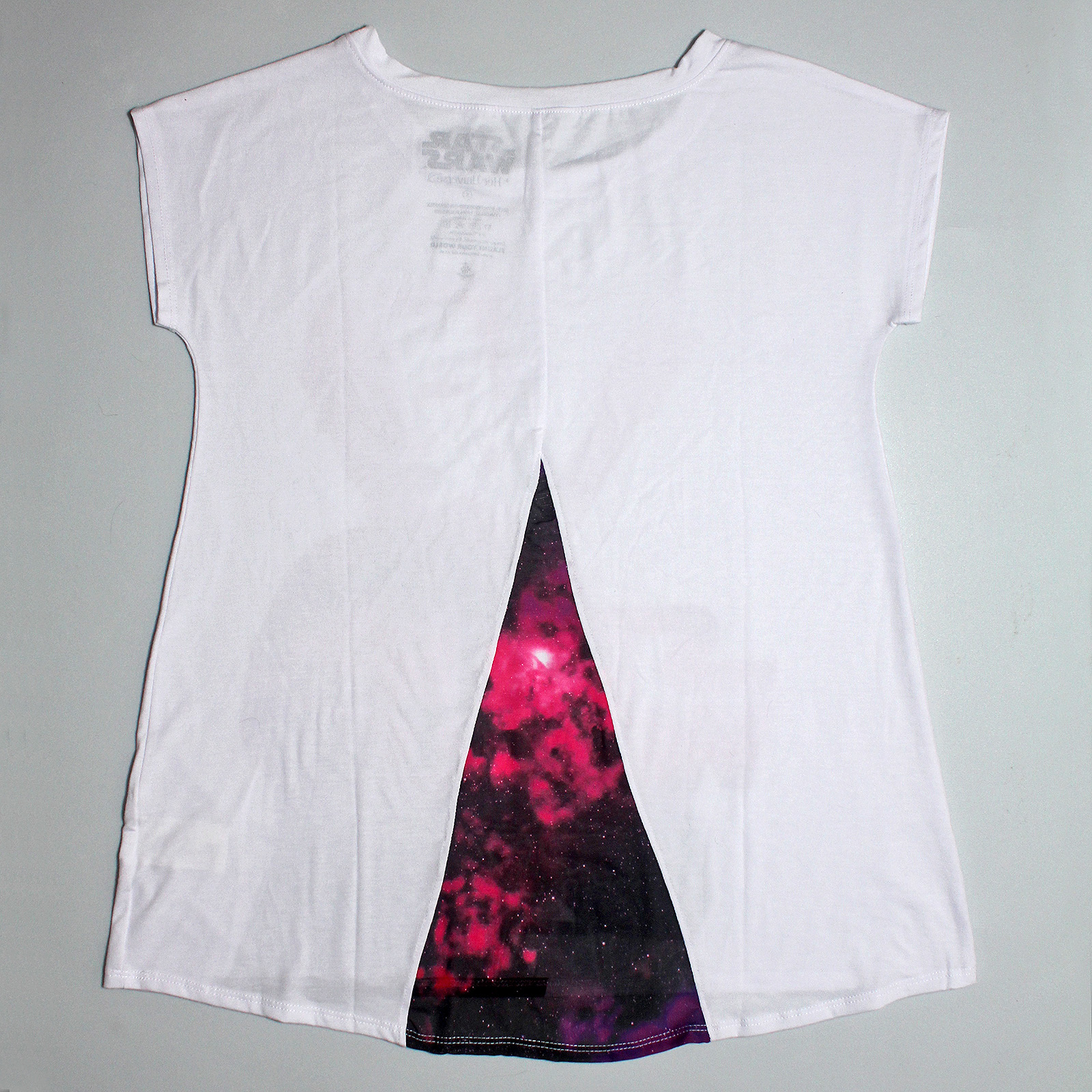 The white dolman-style women’s t-shirt features a front print of Rey and the Star Wars logo, in a pink and purple toned galaxy print. The print is pinker/lighter at the top, darkening with more purple tones through to black at the bottom. The back of the t-shirt has a vertical seam, with a chiffon insert panel in a matching pink and purple toned galaxy design. The back insert design feature was also used in the earlier Her Universe ‘Try Not’ Triangle tee, and I’m really happy to see it used on a Rey themed tee as well. I love a top with a point of interest on the back – the lower edge placement means it’s still visible when wearing your hair down (well, depending on your hair length). Chiffon is a see-through fabric, but the insert finishes below bra-strap height, so it’s not too revealing.