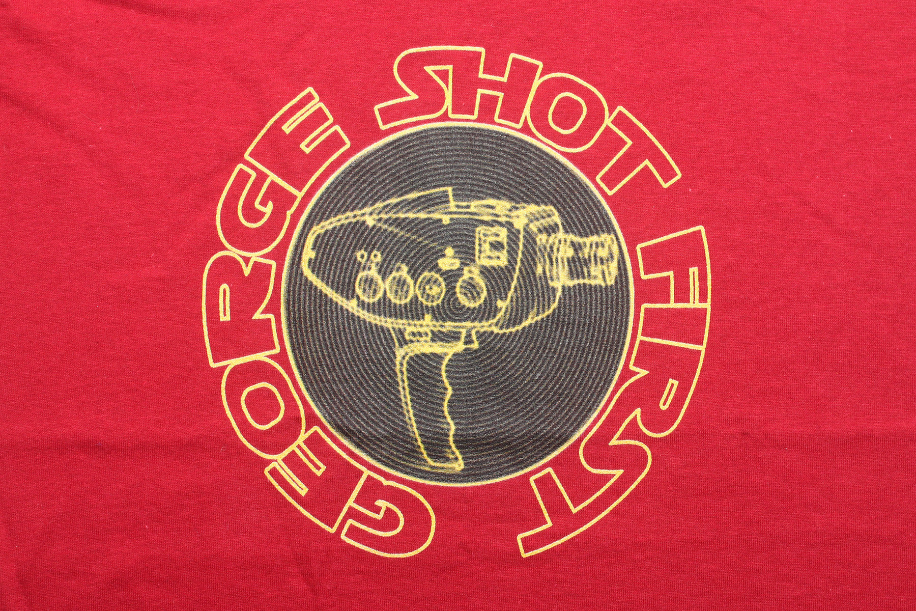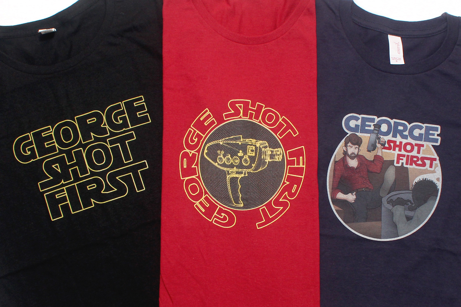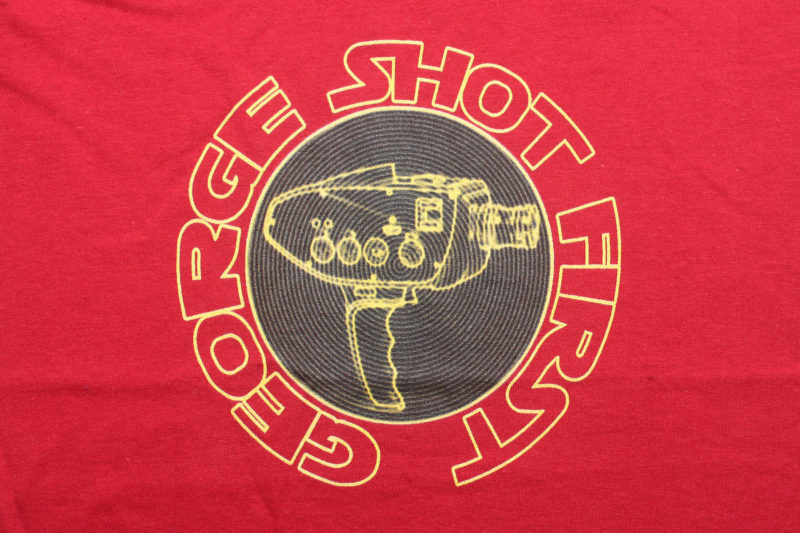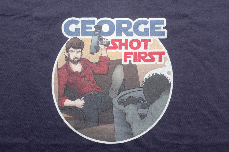 The ‘Cantina’ t-shirt features artwork by Pete Soloway, with George Lucas sitting in Han Solo’s pose across the cantina booth from Greedo, a handheld camera in his hand instead of a blaster. This design has the strongest Star Wars connection from these 3 designs, and is my personal favourite as well. The dark fabric colour shows through the design just a little (more noticeable in the white areas), but this helps prolong the life of the print – it stretches well with the fabric (thicker prints tend to ‘crack’ when stretched).
