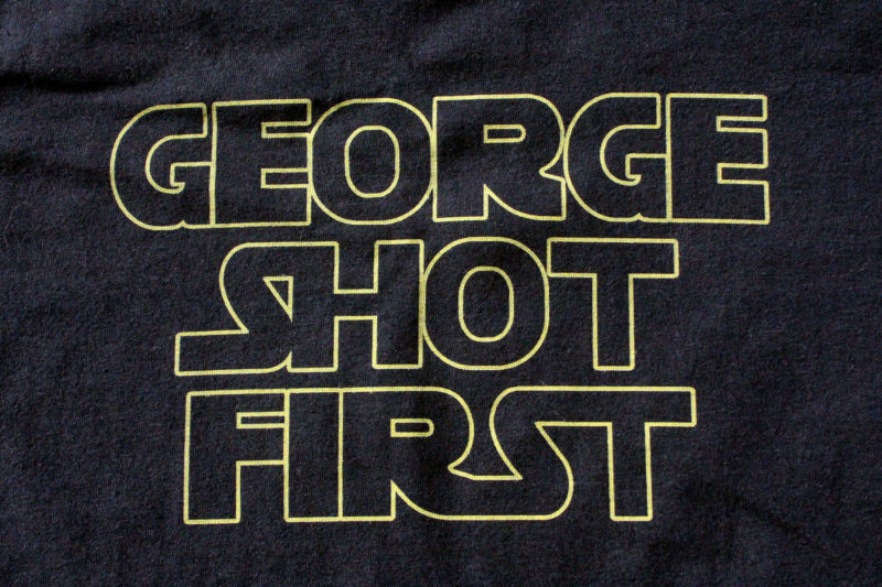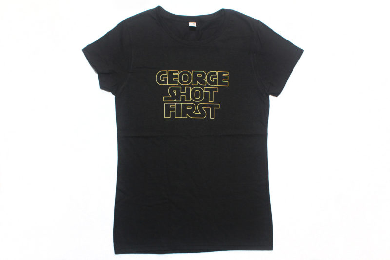 Lastly, the ‘Logo’ t-shirt features the text ‘George Shot First’ in a Star Wars style font. The text is yellow, which stands out well against the black fabric. Despite the fine outlines, the printing is crisp and tidy, and stretches well with the fabric. A simple classic design, referencing the opening title Star Wars logo of yellow text against black.