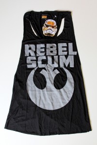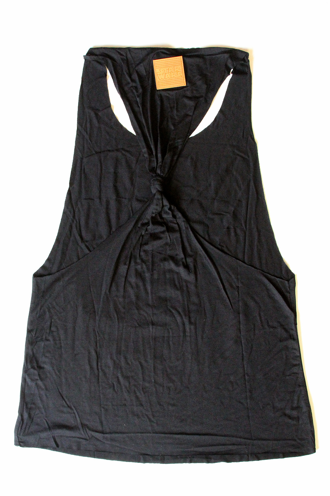 At first I was a little disappointed in the top – the edges are all raw, not finished in the usual seams. The fabric is very thin, which I wasn’t expecting – but the more I thought about it, the edges and fabric make perfect sense for this style. It’s open sides and back mean it’s designed to be worn over a singlet/bandeau top etc. in an summer/exercise type of style, and a heavy fabric doesn’t make sense for that purpose. The raw edges mean the top has a lovely light drape, lessening it’s bulk. The print on this shirt very nearly touches the edges of the fabric – there may be a bigger gap on the larger sized tops. The back features a knot tied in the strap, again adding to it’s casual ‘cut up a t-shirt for exercise’ style. It features the embossed plastic Goldie patch on the back, although mine is sewn a little off level. Overall, I was initially surprised at the lack of seams for a $30 top, but it’s a really neat summer-weight top perfect for rocking some Star Wars pride at the gym.