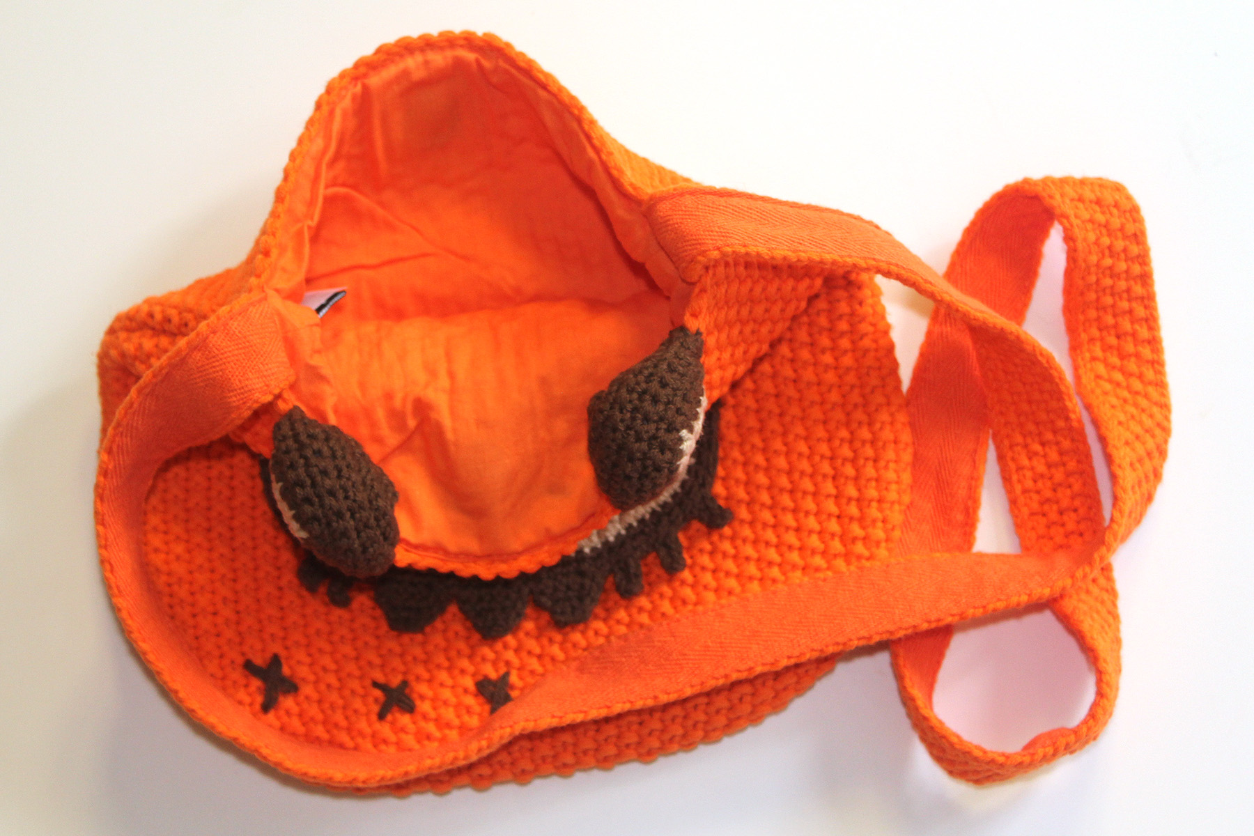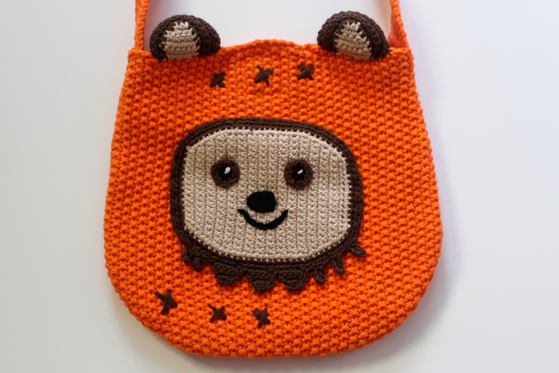 One of the items I bought at my visit to Her Universe’s booth at Celebration Anaheim was the ewok purse. While I’m not usually drawn to bright orange, I couldn’t resist the incredibly cute ewok face on the front. The bag is made from 60% cotton/40% acrylic crochet, with 100% cotton lining fabric. The shoulder strap is reinforced with cotton tape, so it’s sturdy to handle weight if the bag is full. The bag closes with a hidden magnetic closure, which snaps closed nicely – it’s sewn to the outer crochet, rather than lining which I like – I’ve had bags where the lining ripped because of tension pulling open the magnetic closure sewn to it. The crochet is a good thickness, nice and tight stitches but still feels soft – quite snuggly which works great with the ewok design!