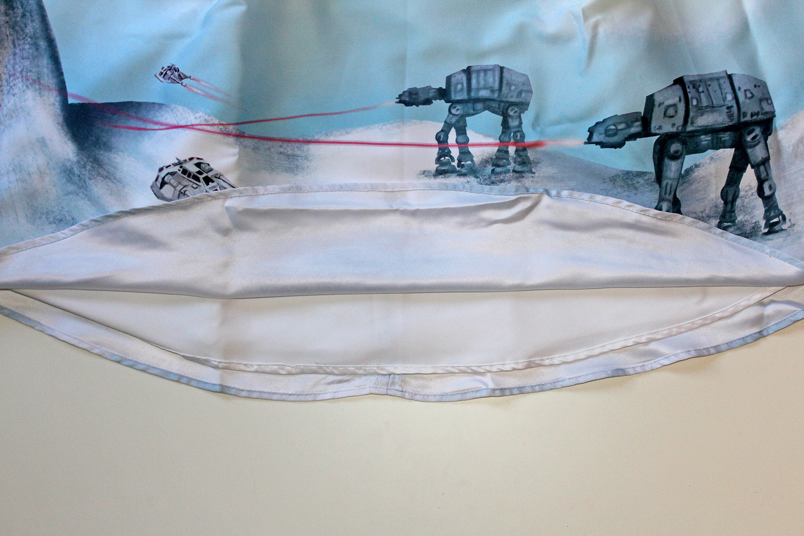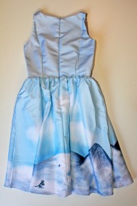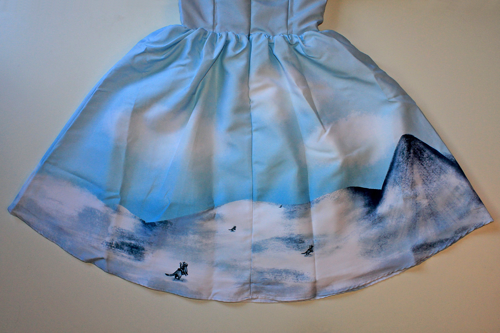 Of course, my favourite part is the printed skirt. On the front is a scene with AT-ATs, an AT-ST and snowspeeders, while the back panel has some very cute tauntauns. I am not aware of the artist, the design appears to have been created specifically for Her Universe to use for this dress. The skirt panels are sewn from full sublimated print fabric, with the skirt hems all folded over twice so no edges are seen. The centre back seam is attached to the lining, so it sits nice and flat. As this dress was photographed straight after arriving in the mail, you can see how it can crease if folded. The garment tag notes this is 100% polyester, do not use steam when ironing and use the heat seating appropriate for polyester. I am so happy to have this gorgeous dress for my wardrobe – I hope Her Universe designs more unique garments like this in the future.