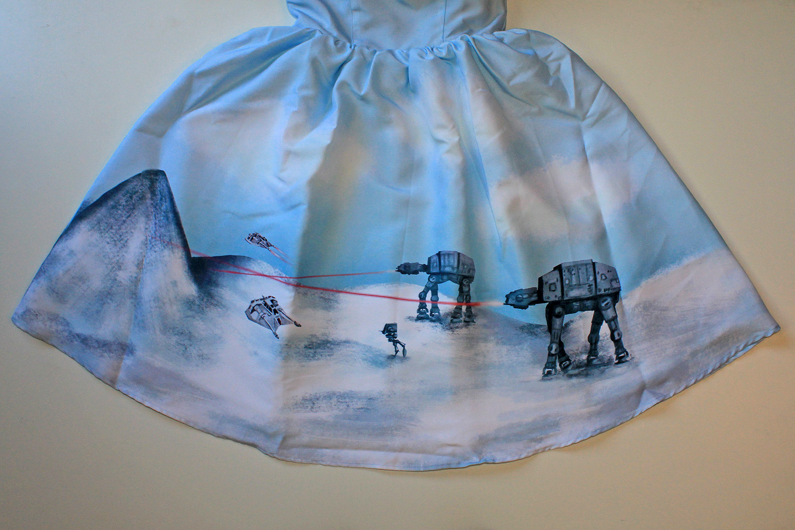 I had seen Her Universe answer a question about pricing on their Facebook page prior to Celebration, so I knew what the price of the dresses would be. I have heard some people were surprised at the cost of US$150 – this is a very reasonable price for the quality. These are not like the stretchy skater dresses – these are proper gowns, fully lined and very well sewn with custom printed Star Wars fabric. I would much rather have a unique garment like this than a pile of t-shirts. The Hoth pin up dress was made in sizes XS to 5X – at time of writing only L and XL are still available *update* Her Universe have confirmed they will be bringing this dress to Star Wars Weekends, so hopefully we’ll see the other sizes restocked on-line too! I purchased mine in XS – the sizing chart notes this as bust 31-32″, waist 24.5-26.5″, hips 34-35″. I found that this dress is true to it’s size chart, keeping in mind that it’s meant to be quite fitted when worn. The skirt measures approximately 58cm long from front waist seam to hem.