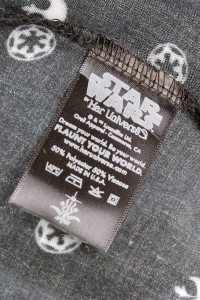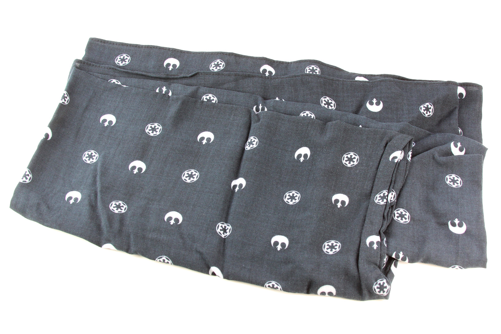 I recently bought the Her Universe symbols infinity scarf, an exclusive item from Thinkgeek. It features the same symbols pattern as the cardigan also by Her Universe, white Imperial and Rebel Alliance logos on a ‘black’ background. Although it actually appears dark blue in person – especially when compared next to other black fabric. The scarf is made from printed fabric, not white logos printed onto plain fabric like the cardigan. Therefore the print is visible on both sides of the fabric, very useful for a scarf, as you can see in my photos below. The fabric is 50% polyester, 50% viscose, which is lovely and soft with a great drape. The edges are finished with a very fine hem, with a standard overlocked/serged seam at the join. Mine has little threads at the edge hem, a result of the narrow turn over, but it’s no matter to clip these off. Lying flat it measures approximately 62cm wide by 72cm long (full circumference is approximately 144cm). I paid US$34.99, it is still available from Thinkgeek. A great addition to my wardrobe for those cooler days.