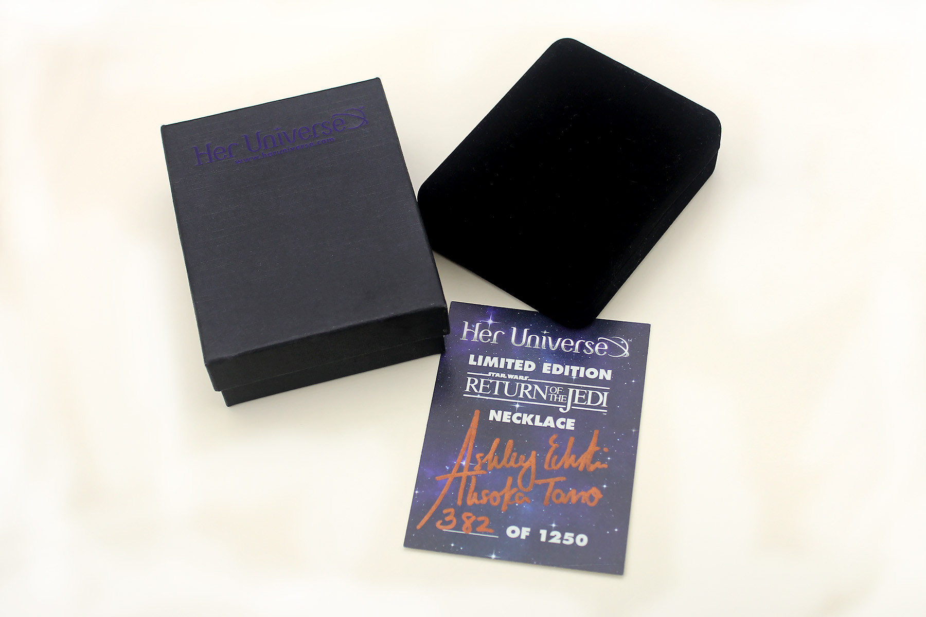 Today’s review features the Her Universe x Star Wars ROTJ limited edition necklace. Released in 2013, the necklace was released to celebrate the 30th anniversary of Return of the Jedi. This necklace is a limited edition item, with only 1,250 made. Each necklace came with a numbered certificate hand signed by Ashley Eckstein, founder of Her Universe.