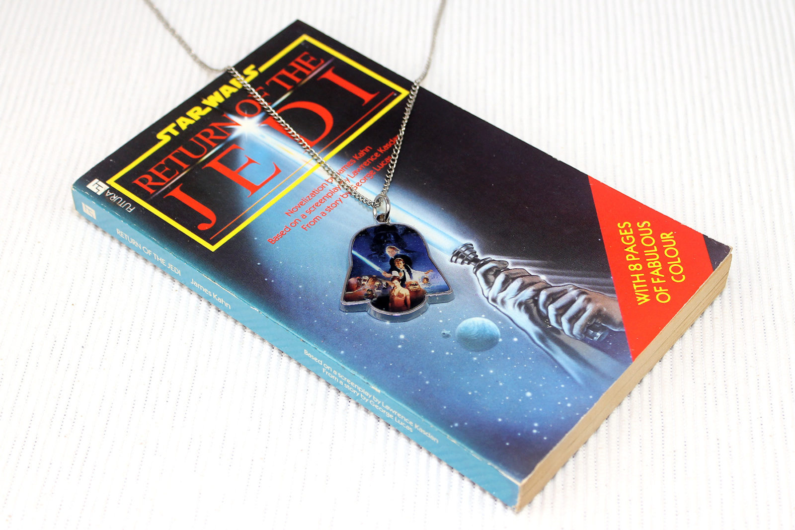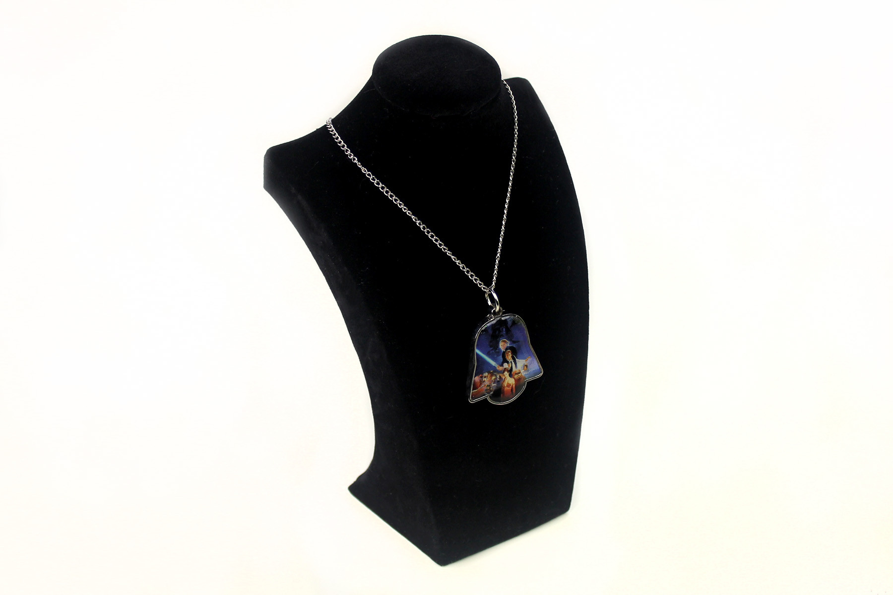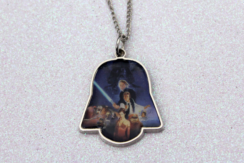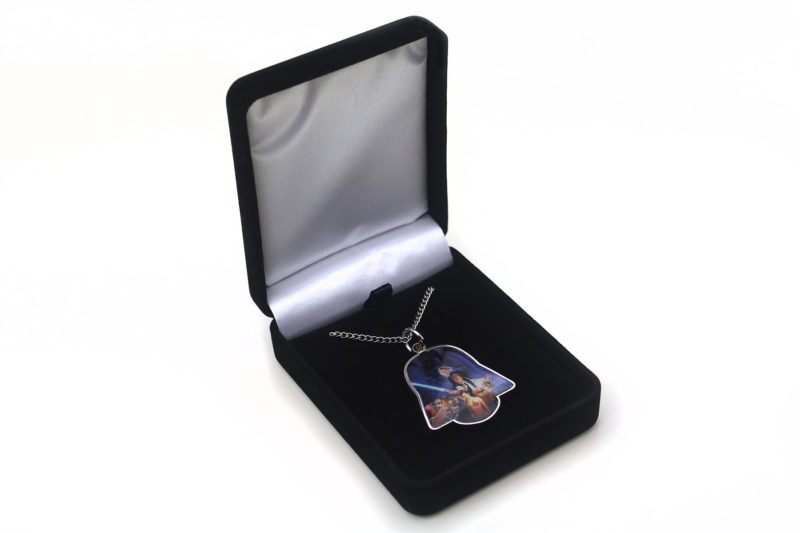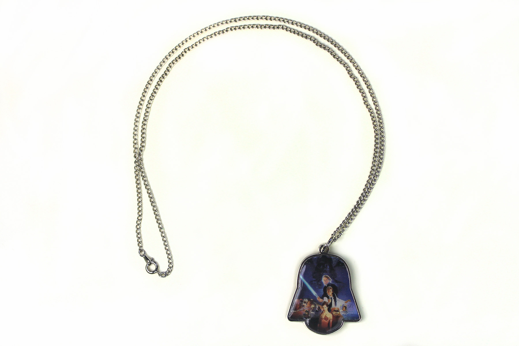 The necklace features a silver tone pendant, in the silhouette shape of Darth Vader’s helmet. The pendant features a printed image of the classic Return of the Jedi poster artwork by Kazuhiko Sano, which includes Luke Skywalker, Han Solo, Princess Leia, and Darth Vader. The image works well inside the helmet shape, so that no major elements are cut out or obscured. The printed image is recessed into the pendant, and covered with a clear plastic coating that adds a lovely gloss finish and protects the image.