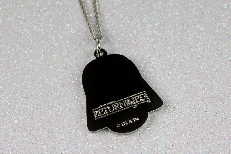 The pendant measures approximately 3.5cm by 3.7cm by 0.3cm (at the widest parts). The back of the pendant has a shiny finish, and features the Return of the Jedi logo stamped into the back. As this is a licensed item, it also bears the standard ‘© LFL & TM’ copyright stamp. The back of most Star Wars jewelry is rather plain, so I was surprised and delighted to see the additional movie logo included on this necklace.
