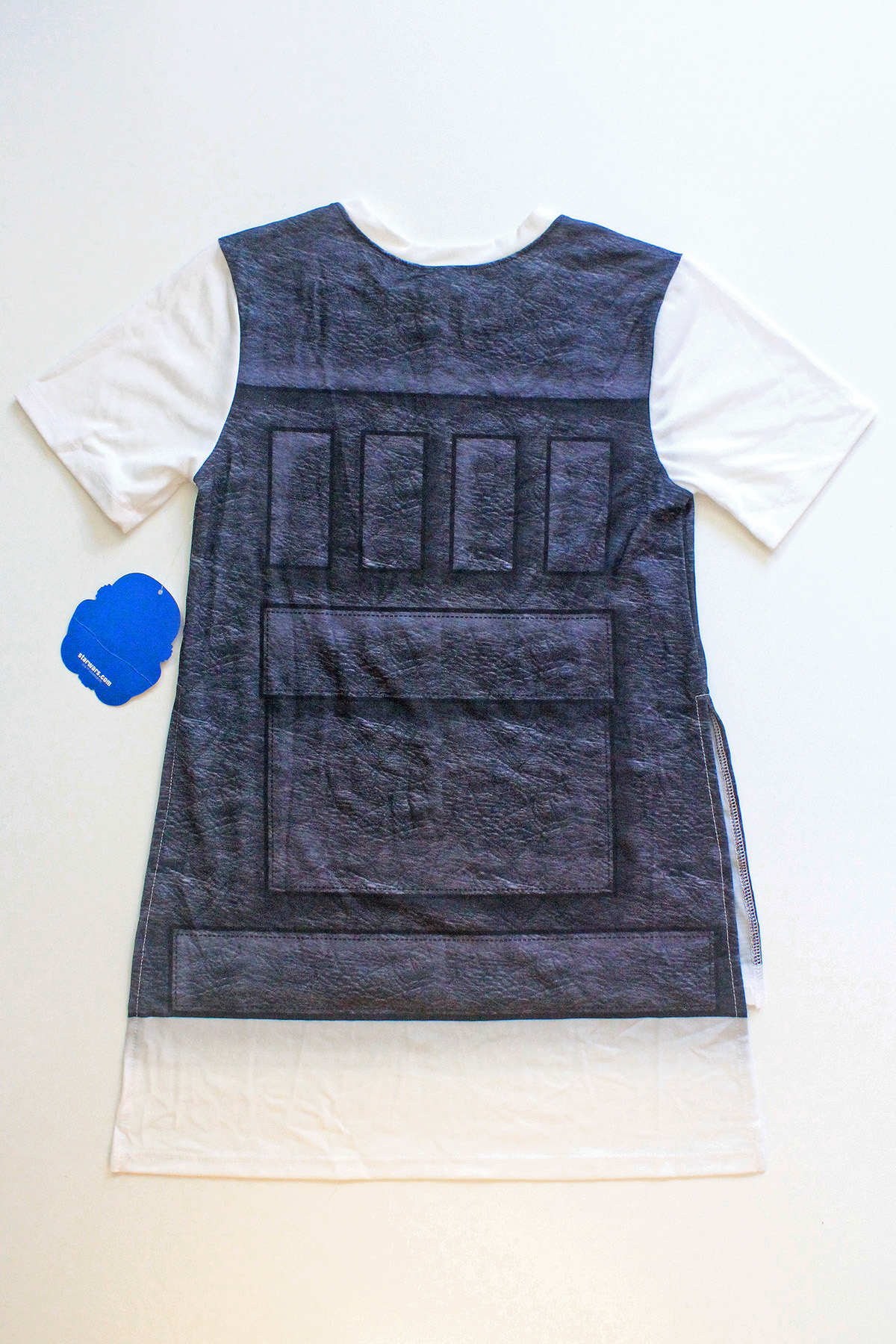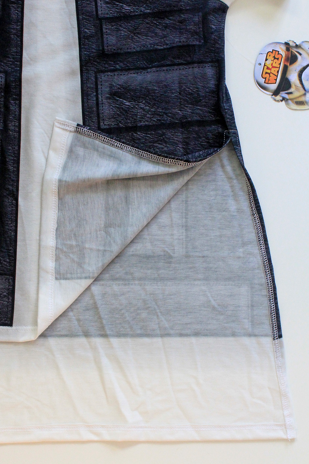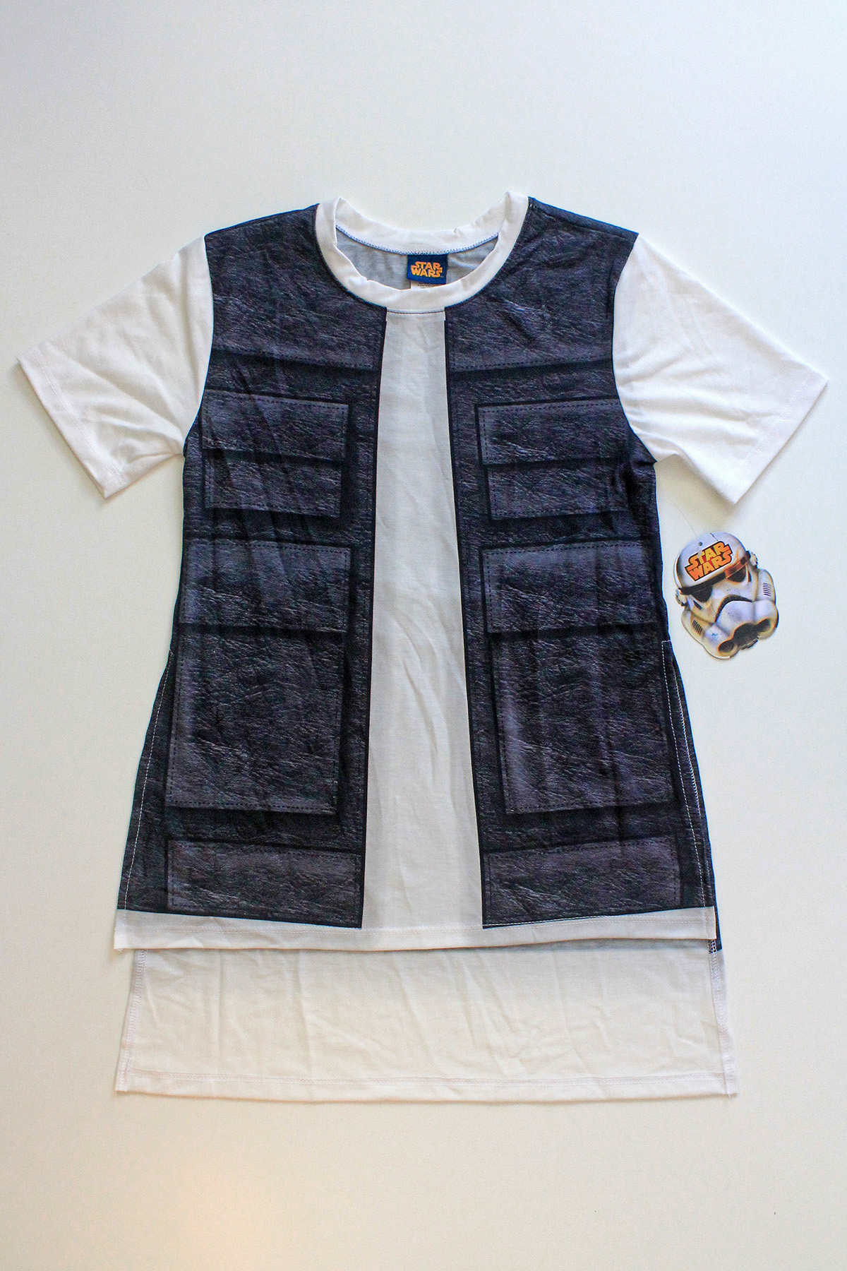 While at Celebration Anaheim I was excited to see the new women’s Star Wars collection from We Love Fine. One item that I really liked was the ‘I Am Han’ t-shirt. Featuring a front and back print using Han Solo’s vest design, the t-shirt has a high side split, with a longer hem at the back. This feature made me immediately think of pairing the top with the Gold Bubble Clothing bloodstripe leggings – the longer hem in the back is great for a little extra coverage when wearing leggings. The print design is really neat – it even has shading details along the front ‘vest opening’ to give the appearance of layering. The fabric is 95% polyester, 5% spandex, it has a lovely drape. I bought mine in a size S, it measures approximately 38.5cm across the chest (underarm to underarm), approximately 47.5cm from front neckline to hem, with the back measuring approximately 11cm longer than the front. The side splits measure approximately 21.5cm up from the front hem, so could show some skin if worn with low waisted pants. I paid US$28 for the t-shirt, which is the same price as on the website.