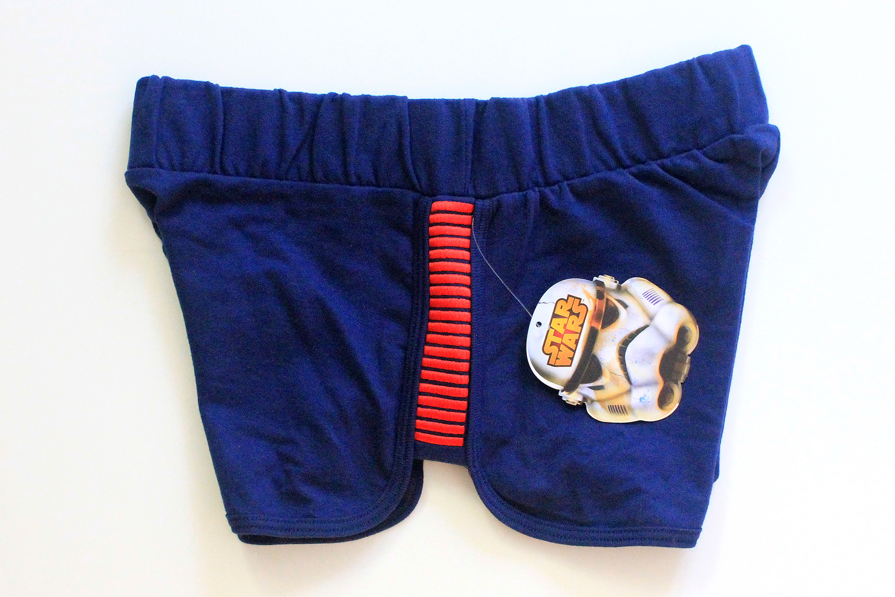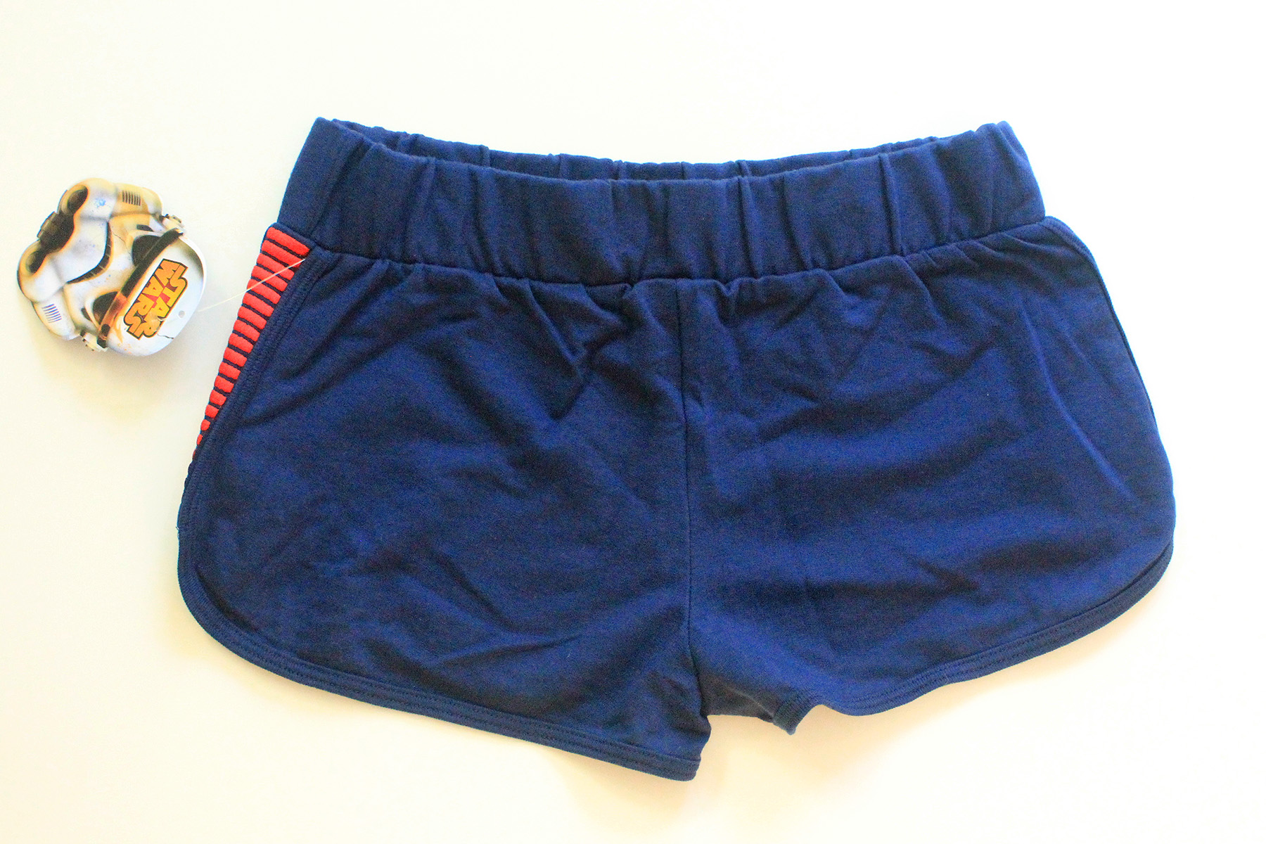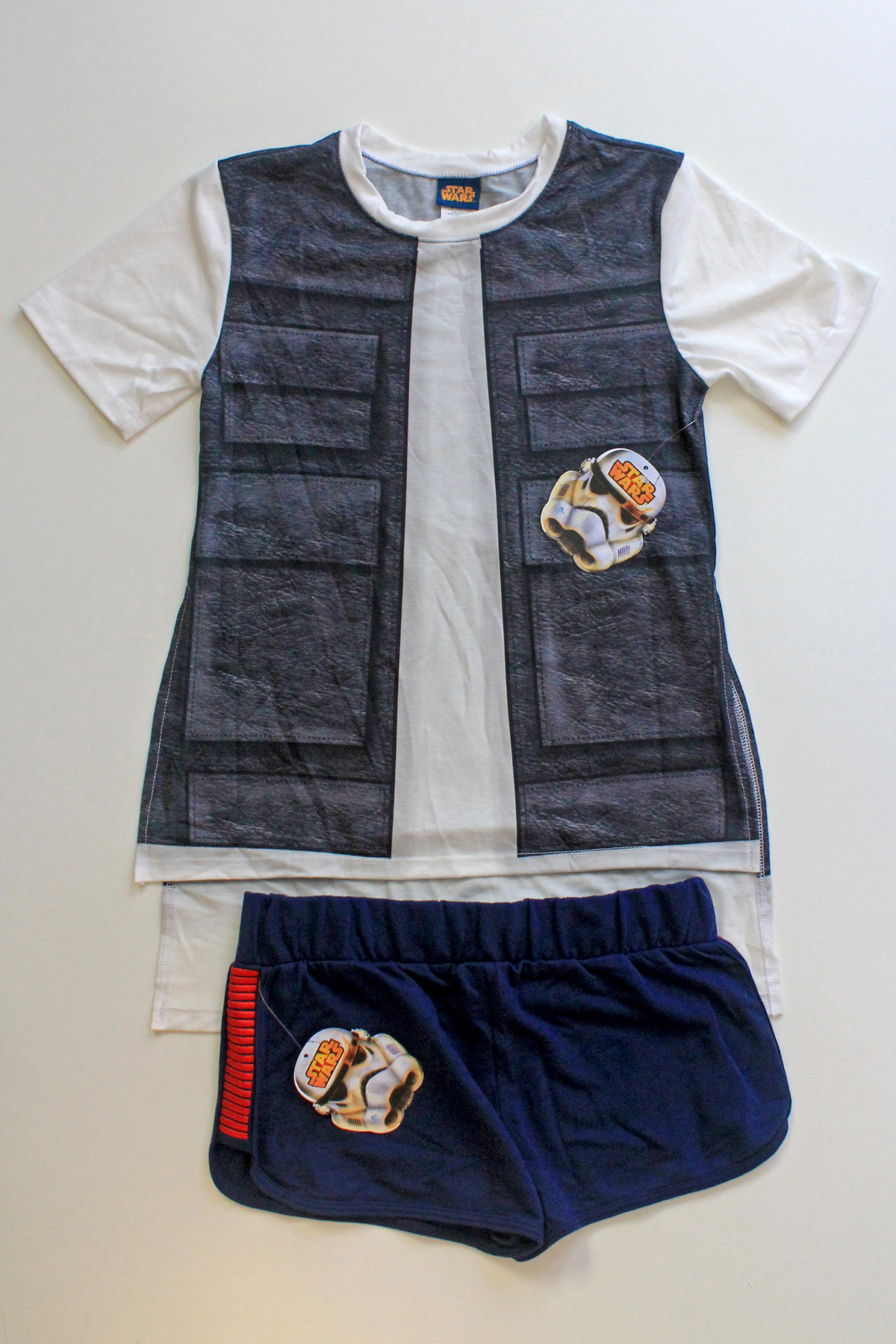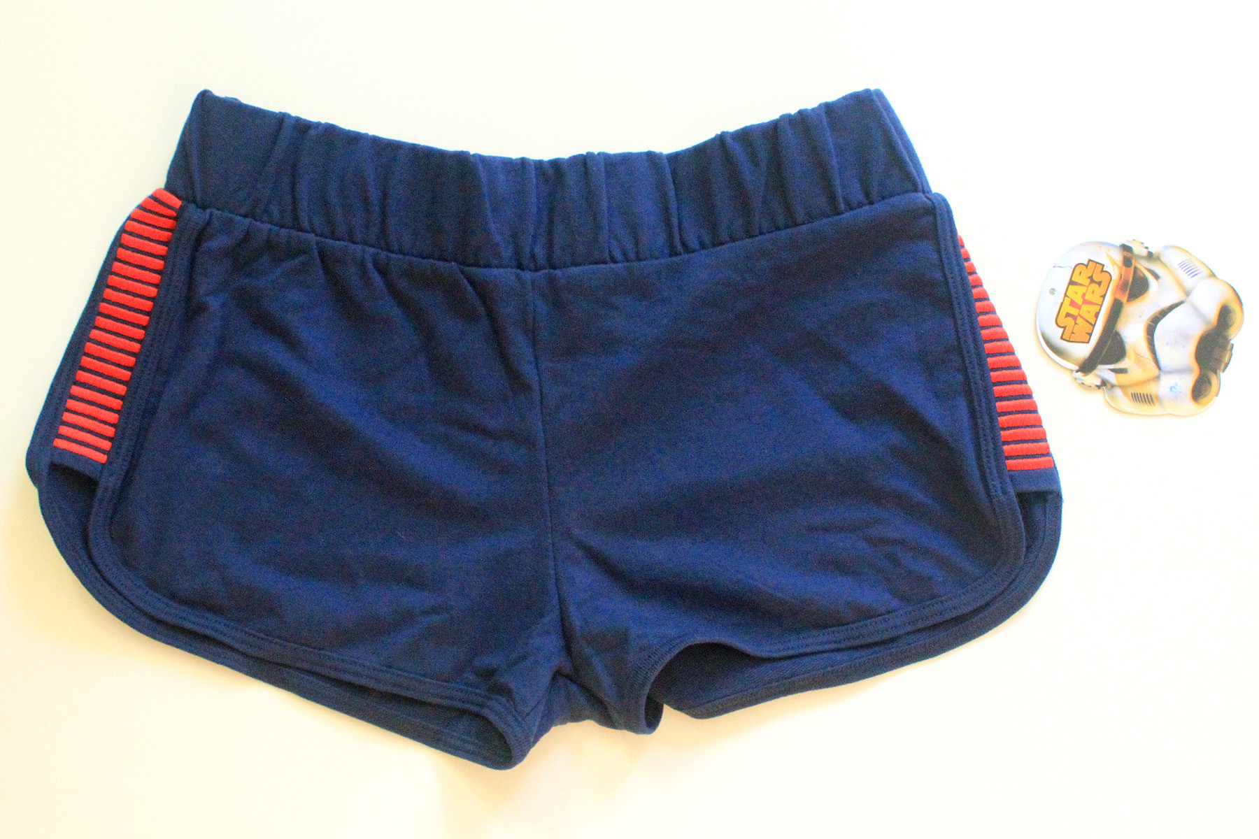 When the collection was added to the We Love Fine website, I took the opportunity to grab the coordinating ‘I Am Han’ shorts on sale. These are a great item on their own or worn with the Han Solo t-shirt. They feature side panels with red bloodstripe embroidery and elastic waist band. The fabric is 60% cotton, 40% polyester, a nice thickness for shorts. I bought mine in size S, they measure approximately 34cm across the waist band, the bloodstripe panels measure approximately 14cm long. The shorts retail for US$35, but I paid US$31.50 for them on sale. I think this is a great set if you’re looking for a casual smuggler look, perfect for summer. I love the all the neat details, like the t-shirt’s side split to show off the bloodstripes when worn together.