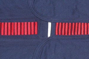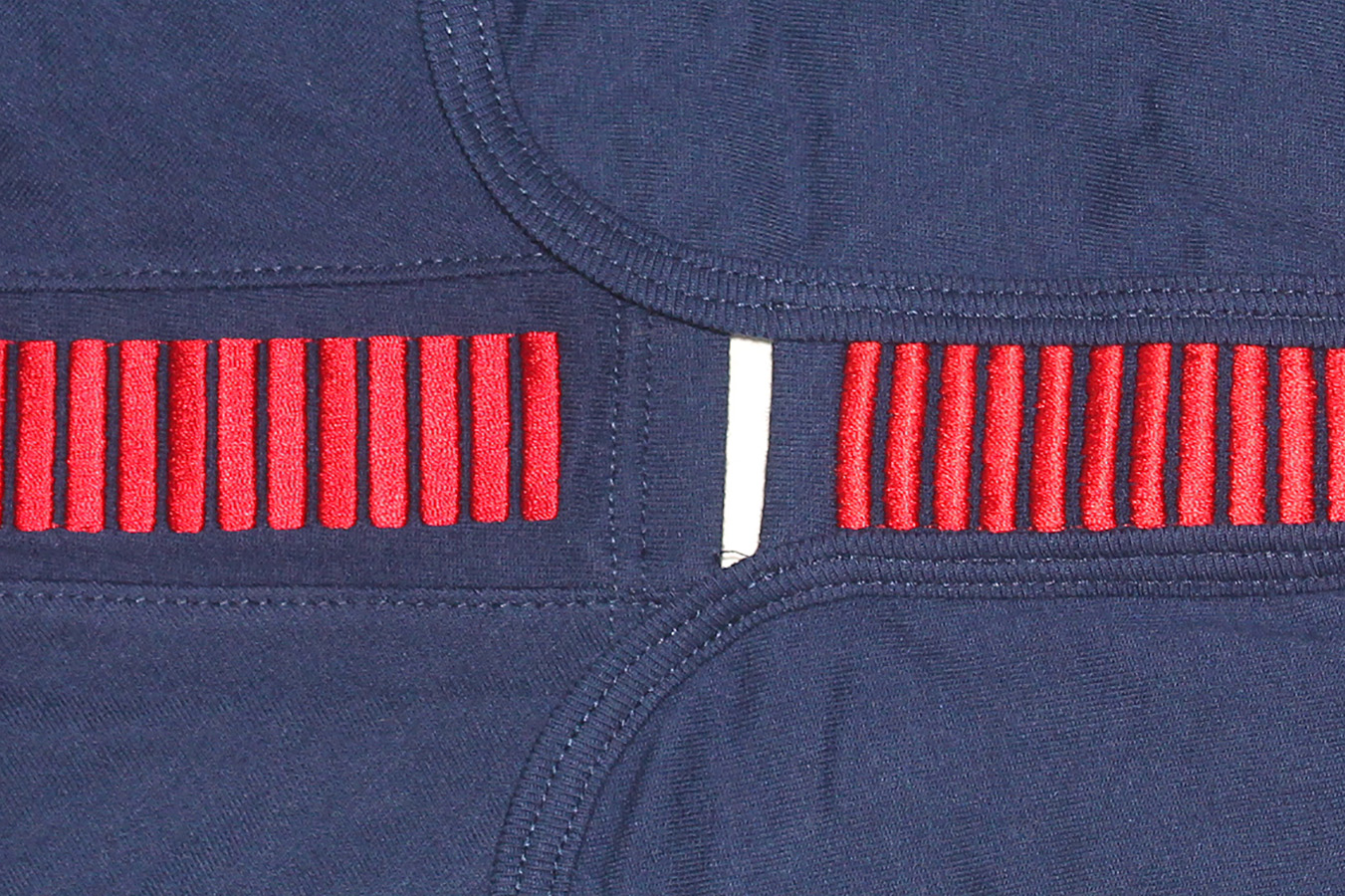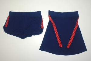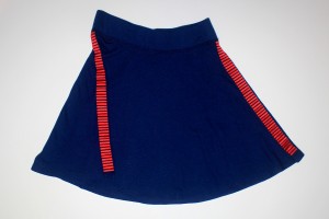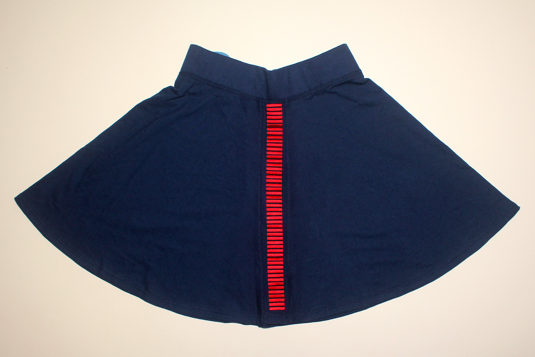 It was interesting to compare the skirt to the shorts – they are indeed very similar, but it’s great for fans to have options. The blue knit fabric is the same for both (60% cotton, 40% polyester), and the elastic band appears to be the same width (the waist band fabric is more gathered on the shorts). Both garments have red Corellian bloodstripes embroidered on an insert panel – but the stripes are just slightly ‘thicker’ on the skirt. In the close-up embroidery comparison photo below, the skirt is on the left, shorts are on the right – that photo also is the most accurate portrayal of the blue fabric colour of the garments. You can read my earlier review of the shorts (and coordinating t-shirt) here.