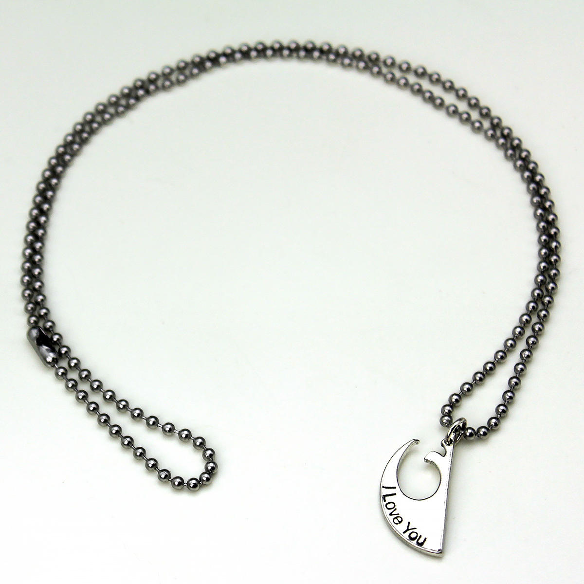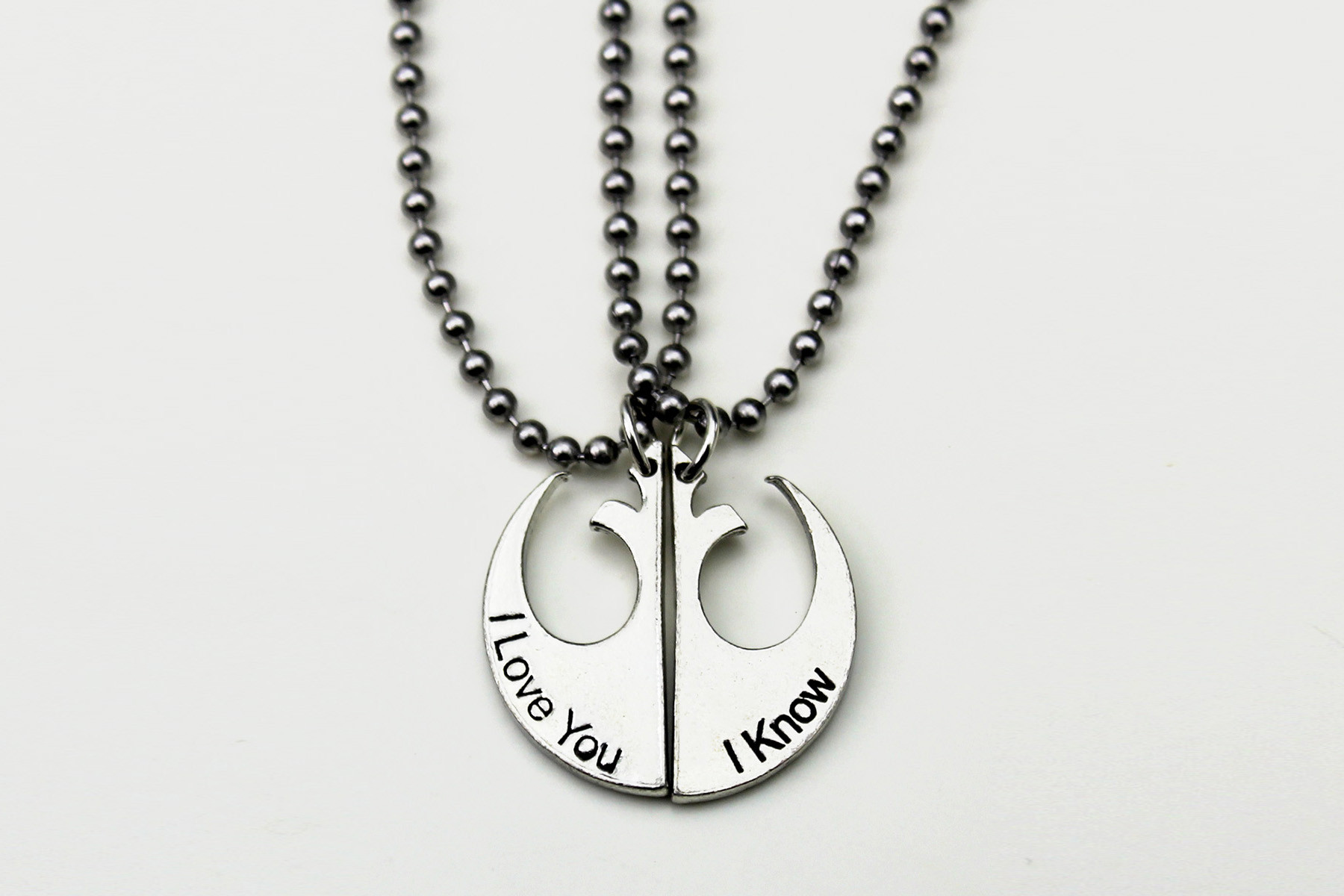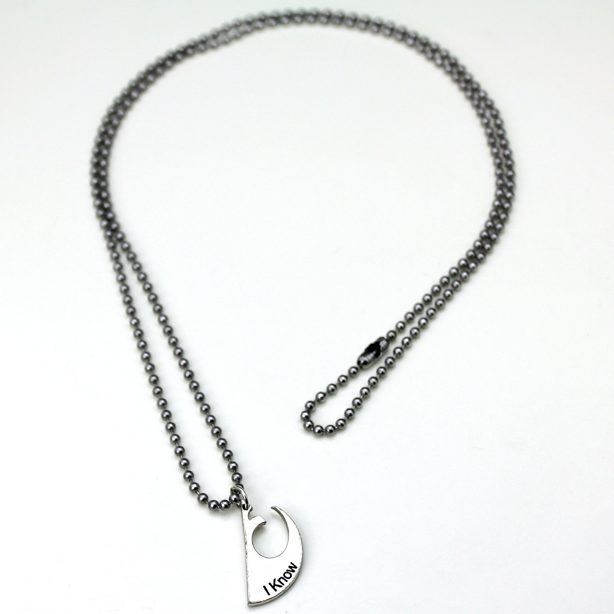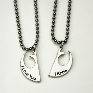 The set comes with two ball-chain necklaces – one is 20″ long (with the ‘I Love You’ pendant), while the other is 28″ long (with the ‘I Know’ pendant). The idea is that you wear the ‘I Love You’ half, while you give the other ‘I Know’ half to a partner. The assumption is your partner is a guy, to follow with the Leia and Han reference, so that’s why the second chain is longer – but the pendants can be easily removed and switched to opposite length chains if you prefer, or cut the ball chain to your preferred length, or remove the pendants from the chains and hang them on different style chains/cord of your own choosing.
