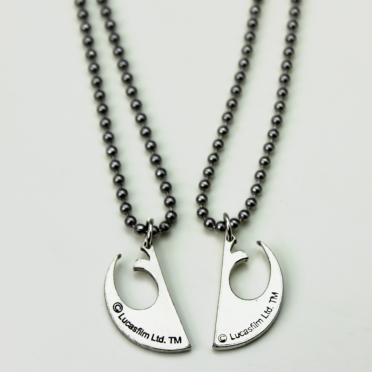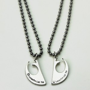 The necklace set came packaged inside a cream coloured satin drawstring gift bag, with the Star Wars and Her Universe logos printed in red foil (the foil on my bag has rubbed a little over the past year). Inside, the necklaces are held on a black cardboard jewelry card, with a little paper note with the item name and jewelry materials etc. The necklace set features a ‘best friends’ style pendant design, in that the two pendants are two halves of a shape – in this case, the two pendants form a complete Rebel Alliance ‘starbird’ symbol when placed together. The ‘left’ pendant is stamped with ‘I Love You’, while the ‘right’ pendant is stamped with the following reply ‘I Know’ – as spoken by Princess Leia and Han Solo (or reversed, depending which film you prefer to reference). The back of each pendant is stamped with the standard Lucasfilm copyright text, noting these are licensed Star Wars items. The paper insert notes the materials are ‘Pewter charm, Stainless steel ball chain, Sterling silver jump ring’. Each pendant measures approximately 2.5cm tall (1″ tall), and approximately 12mm across at the widest part.