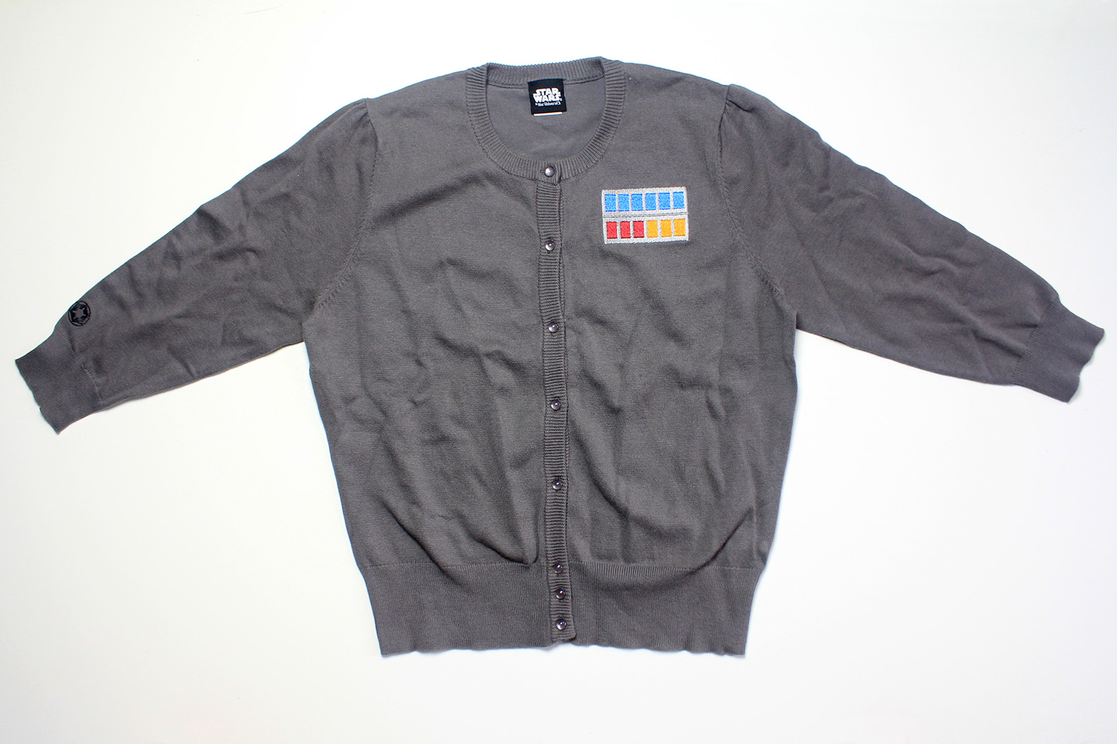 Amongst my purchases from the Her Universe booth at Celebration Anaheim was the Imperial High Commander cardigan. It was first previewed in early April, paired with the pin-up Hoth dress (which I reviewed here), and of course I fell in love with the whole outfit. This is a great example of taking a costume and designing a real-world garment version – the colour and rank badge are those of Grand Moff Tarkin (the rank badge is known as ‘High Commander’, hence the cardigan’s name). I paid US$50, though unfortunately this cardigan is currently out of stock in all sizes from Her Universe.