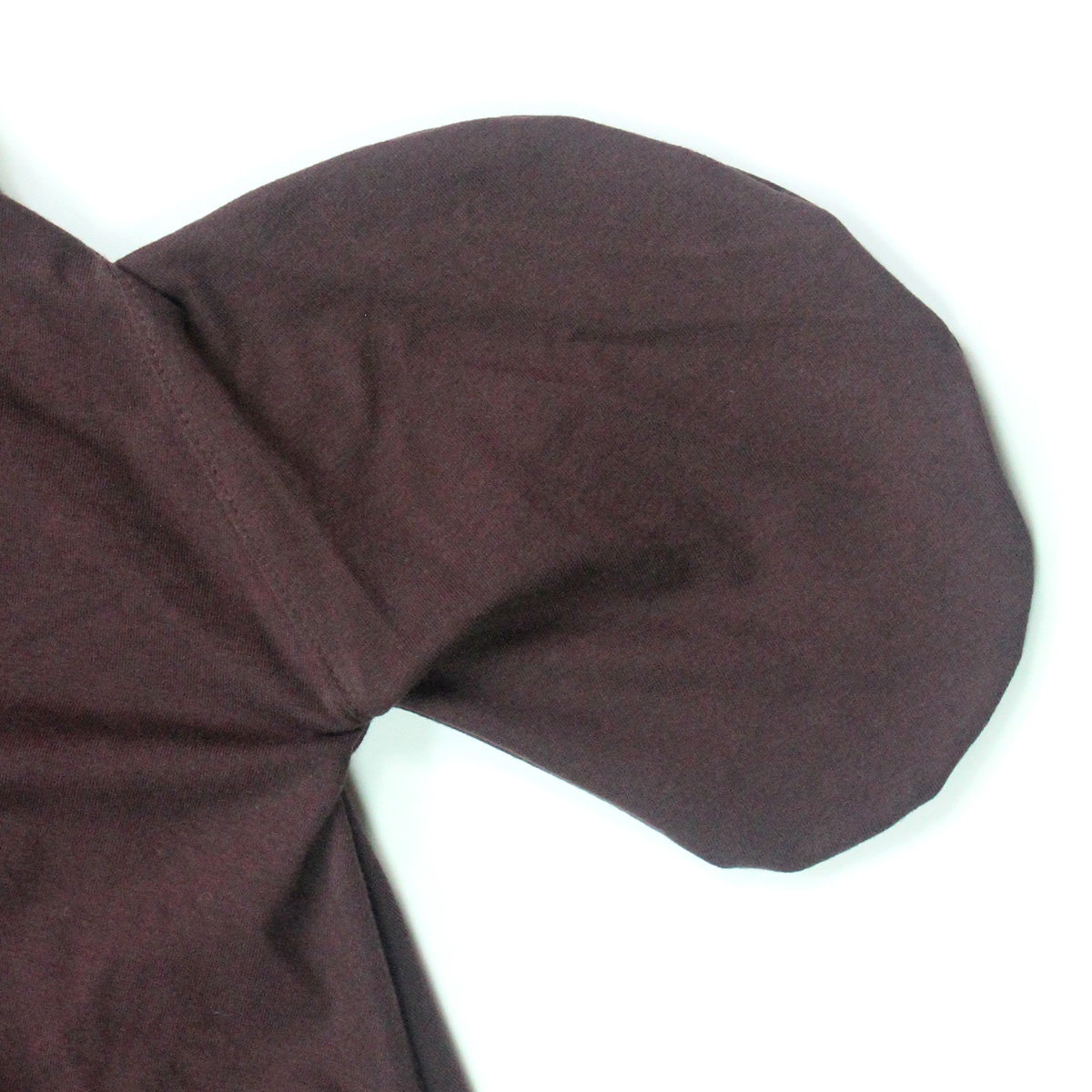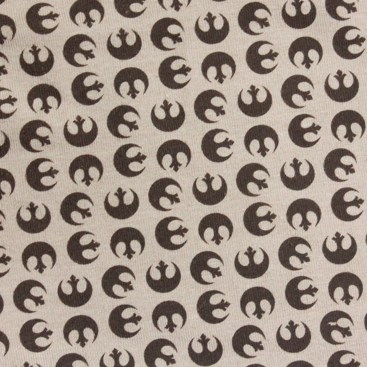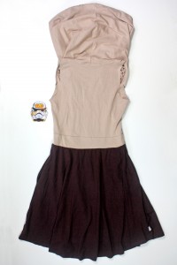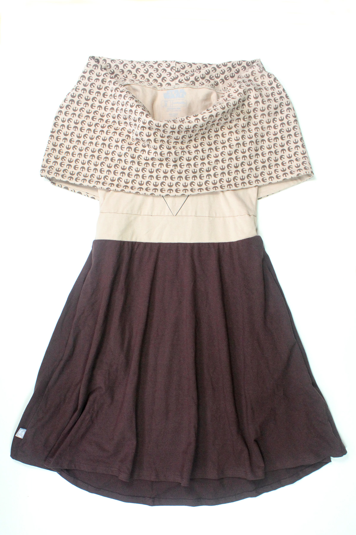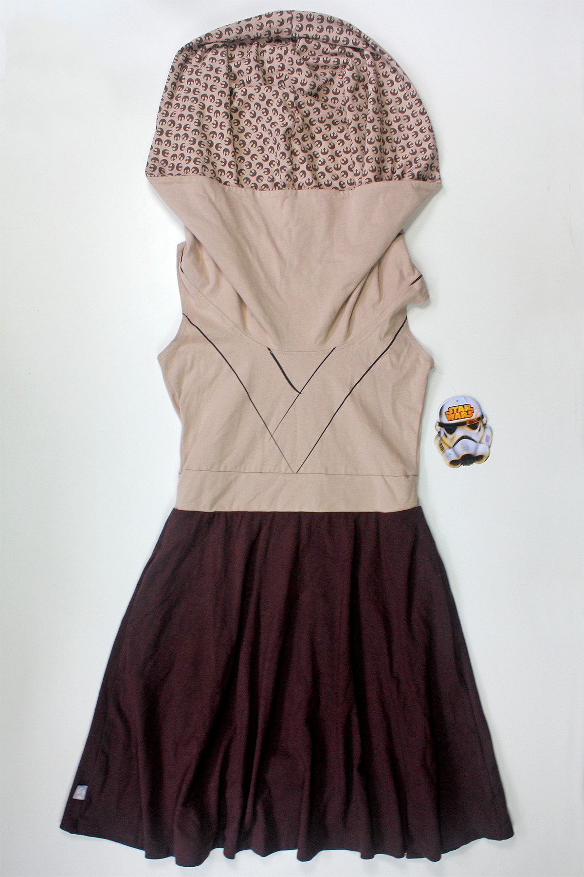 The dress is sleeveless, with a waistband and flared skirt. The top and waist band are beige, while the skirt is brown – the front of the top features printed black lines to resemble the neckline of the classic jedi tunic. The cowl is attached at the neckline, and is lined with fabric printed with a small repeating Rebel Alliance symbol design. While I do wish they had used the Jedi Order symbol instead, the Rebel symbol is appropriate if you think of this dress as Original Trilogy-era inspired. The fabric is 95% cotton, 5% spandex – so it’s soft and comfortable with a great amount of stretch. There is a small band of elastic sewn into the seam between the waistband and the skirt, to help keep the dressed fitted through the torso – but it’s not tight or restricting. I bought mine in size S – it measures approximately 35.5cm across the chest (underarm to underarm), 32.5cm across the waist band, while the skirt measures approximately 47cm from the waist band to hem (at the sides) – all measured while laid flat/unstretched.