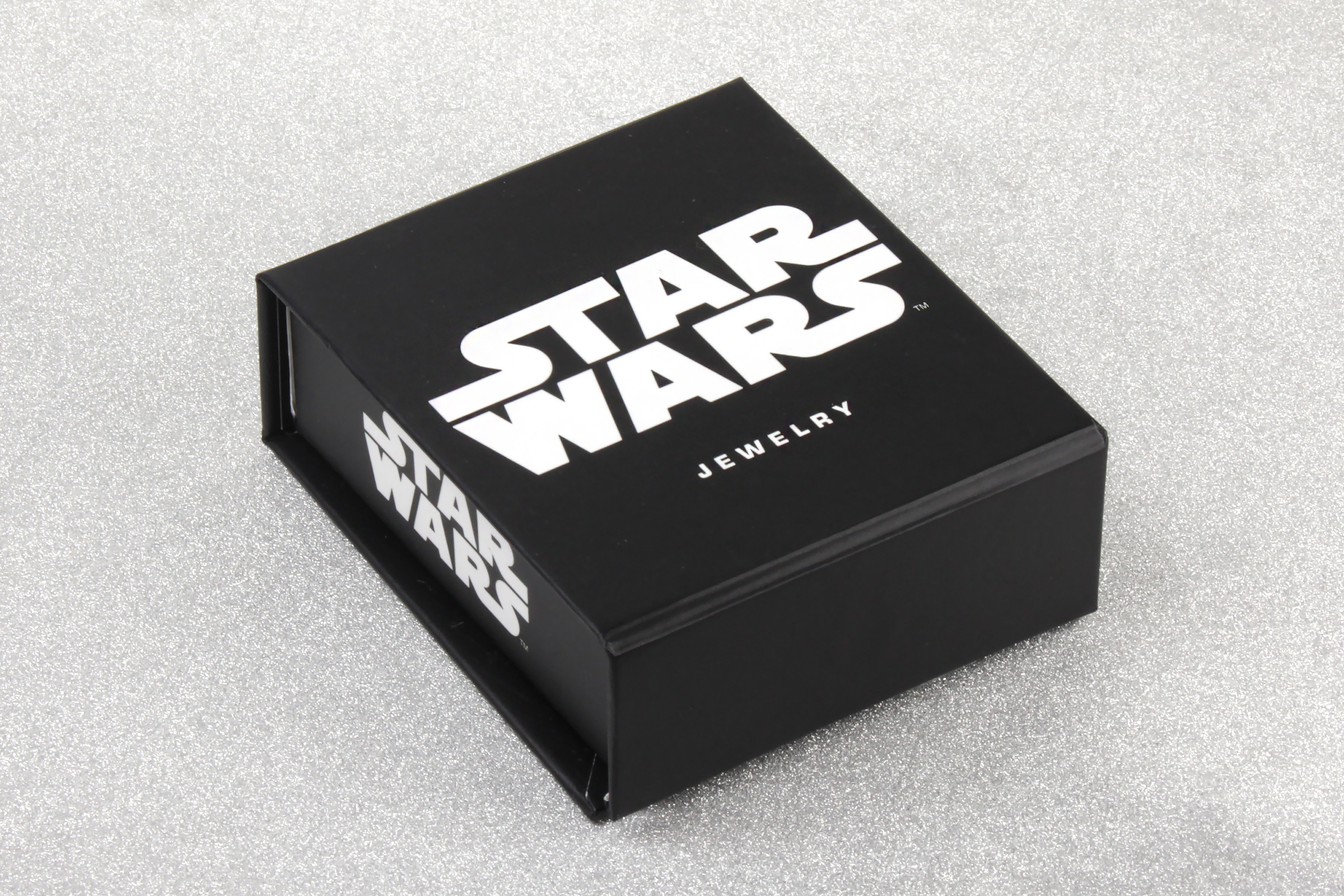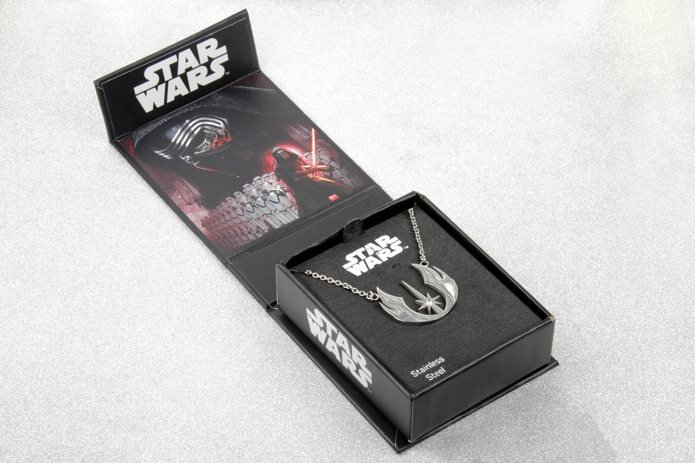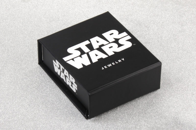 The necklace came packaged in a black coardboard gift box, with hinged lid. The outside of the box is black, with the Star Wars logo printed in white on the top and sides. The underside of the box features the Disney and Star Wars logos, along with the manufacturer information – this necklace is made by Body Vibe. The inside of the lid features artwork of Kylo Ren and First Order stormtoopers as seen in The Force Awakens.