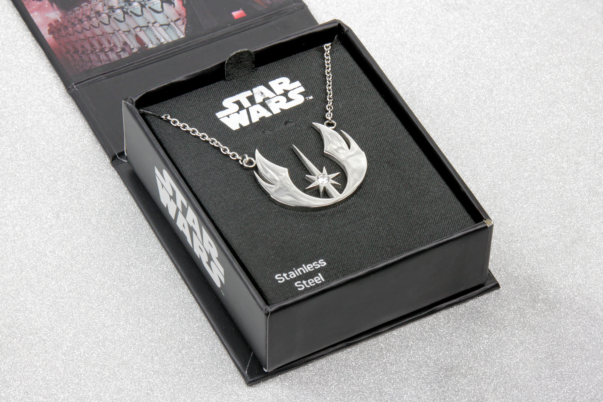 Inside the box, the neckace is secured to a cardboard insert with a satin fabric surface. The insert has the Star Wars logo printed in silver, and also notes the necklace is made from Stainless Steel. The necklace is held in place by the chain passing through two slots in the top of the insert card, with the rest of the chain tucked away behind it.