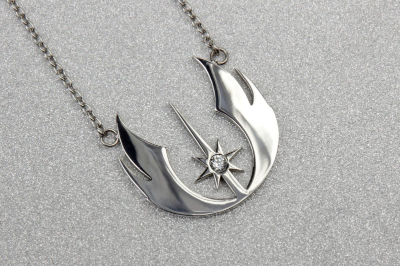 The Jedi Order symbol has always been one of my favourite Star Wars logos. The design resembles a lightsaber, with a star shaped ‘shine’ design around the lightsaber hilt, and surrounded by wings. In this necklace version, the lightsaber part of the design features a clear Cubic Zurconia stone – which is a perfect decorative touch for jewelry. The CZ stone resembles a shining Kyber crystal, held in the center of a Jedi lightsaber – the 6-pronged star design around the lightsaber dates back to classic 1977 Star Wars poster artwork by the Hildebrandt brothers.