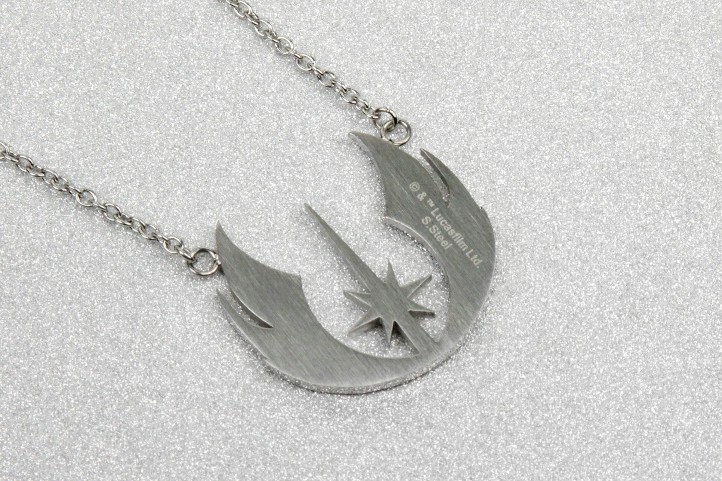 The back of the pendant has a brushed finish (not gloss like the front), and has the standard Lucasfilm copyright text etched in very small print. The text also notes the necklace is made from Stainless Steel.